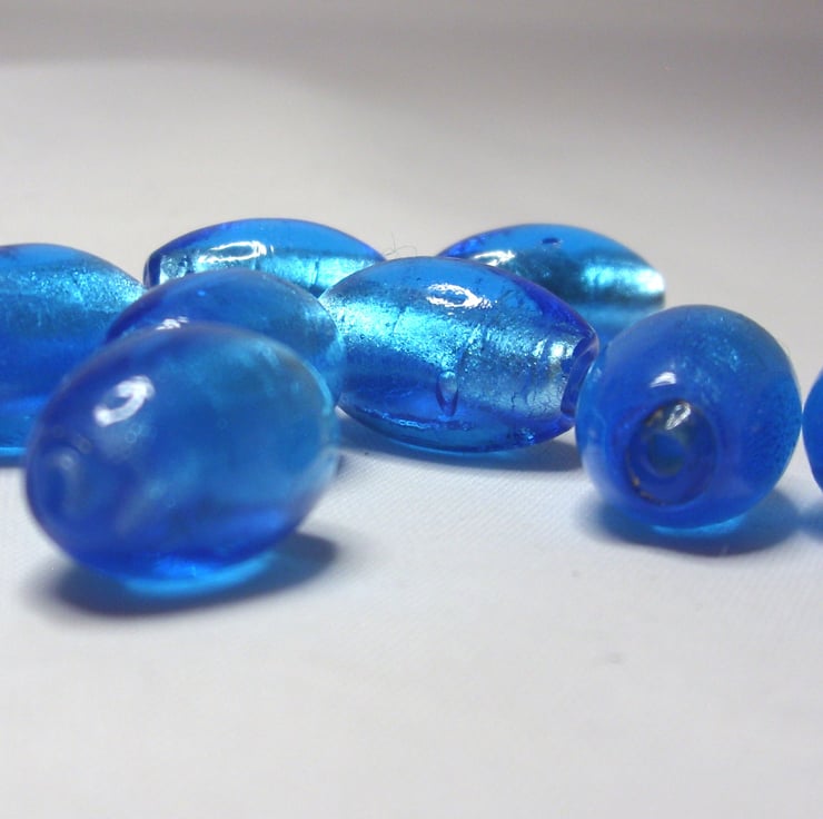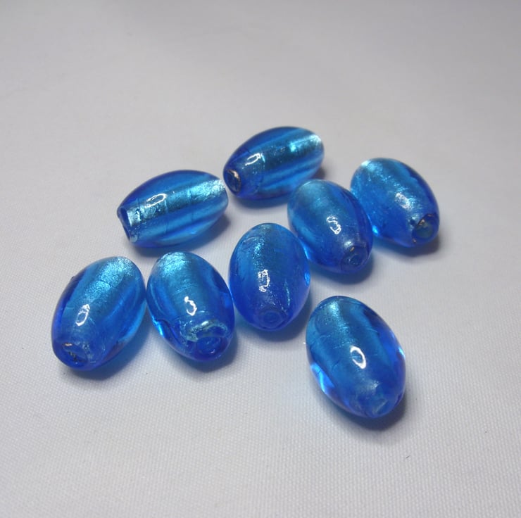 This is a packet of 8 turquoise blue foil lined glass beads. The beads measure 20 mm in length and 14 mm at the widest point. The drill hole is approx 3 mm in diameter.