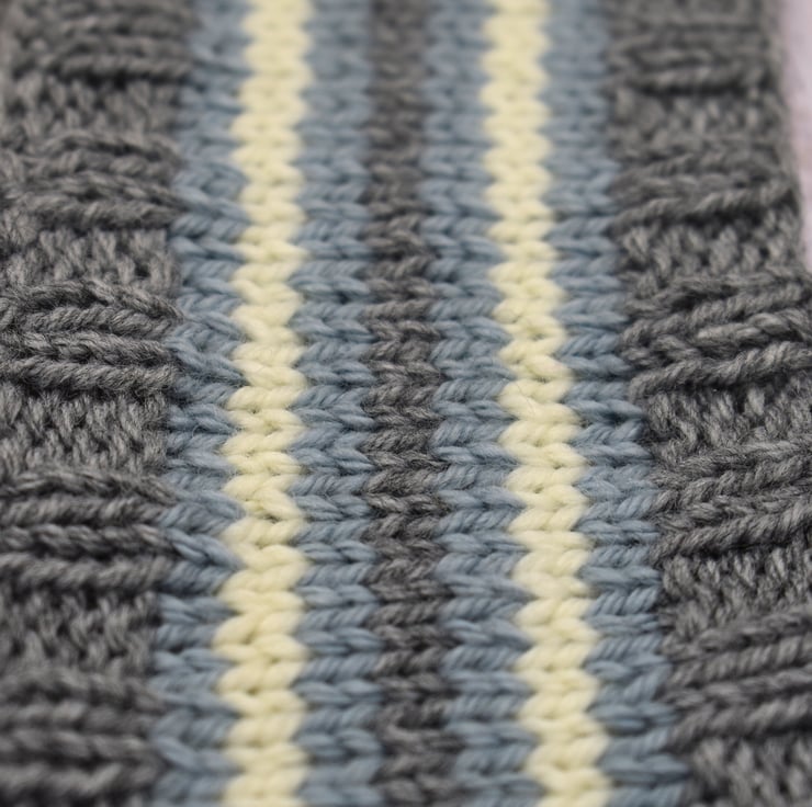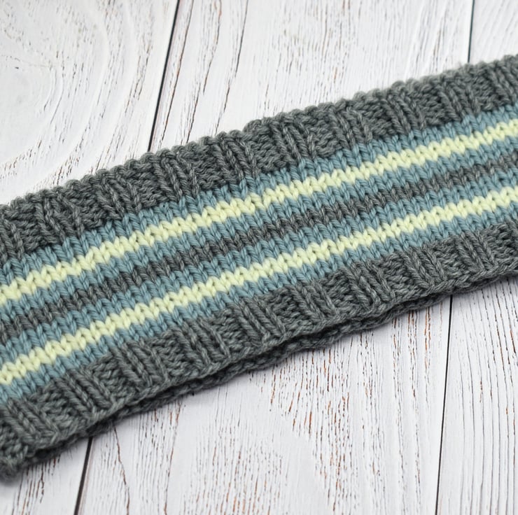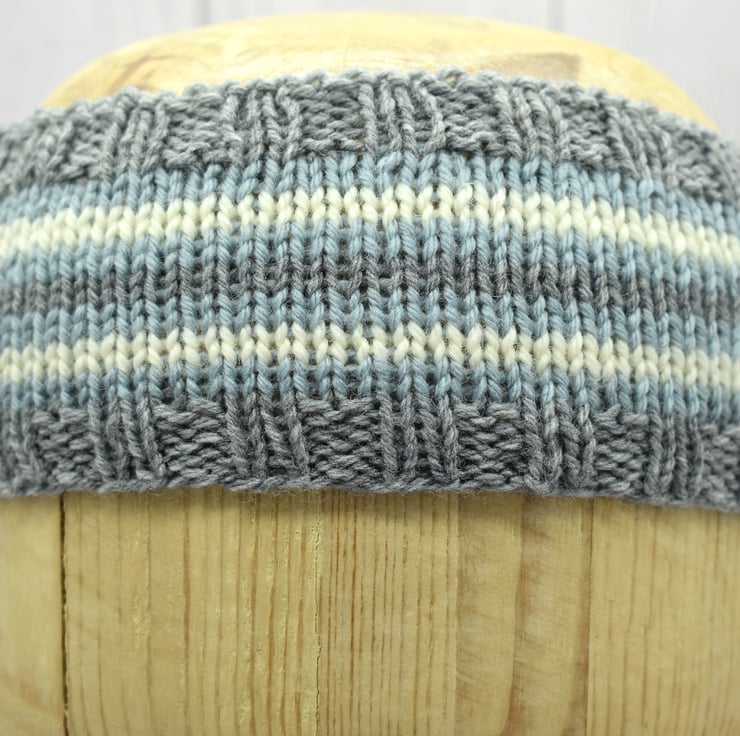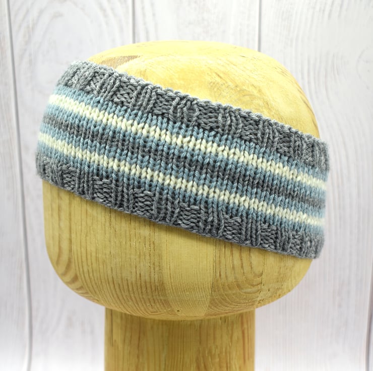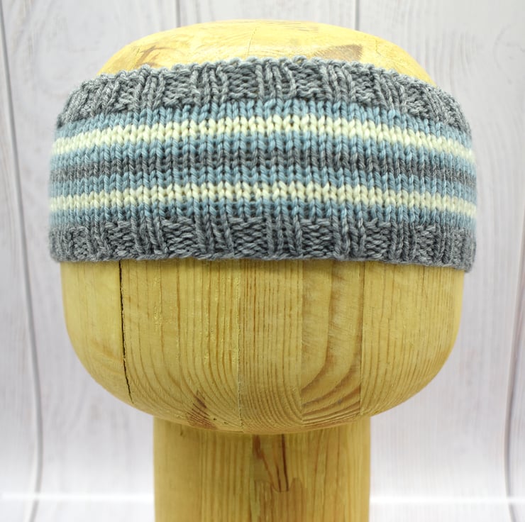 Hand knitted toddler headband in soft grey with blue and cream stripes. Made using a beautifully soft cashmere and merino blend yarn, this cosy headband is gentle against sensitive skin while helping to keep little ears warm.