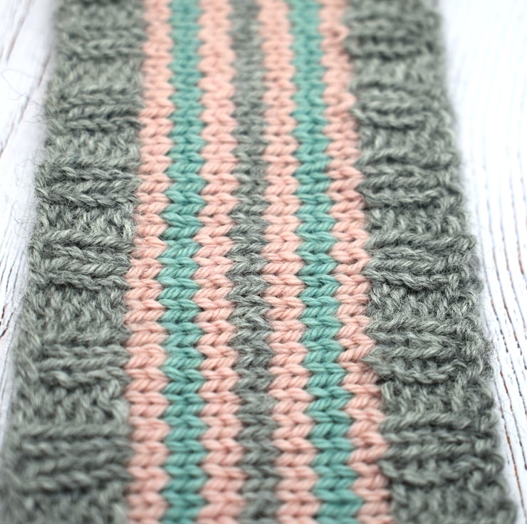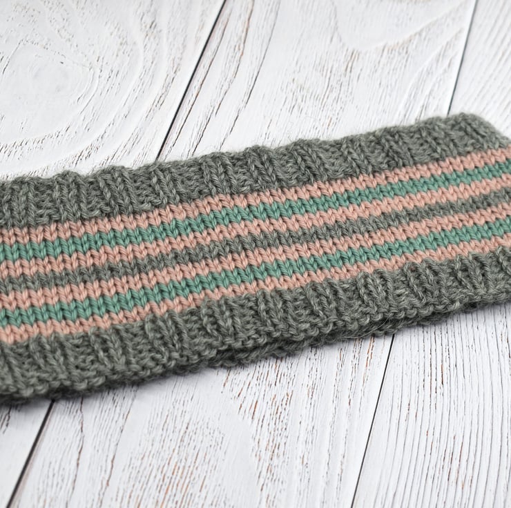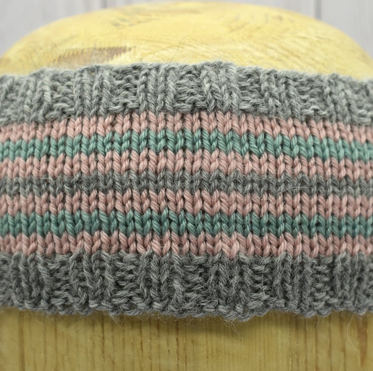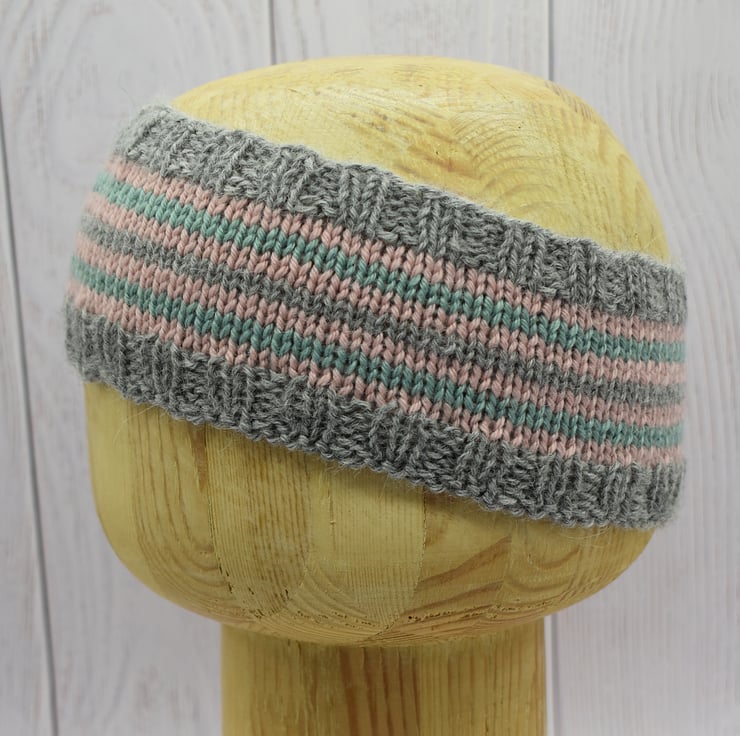 Hand knitted headband in soft grey with pink and teal stripes. Made using a beautifully soft cashmere and merino blend yarn, this cosy headband is gentle against the skin while helping to keep ears warm.