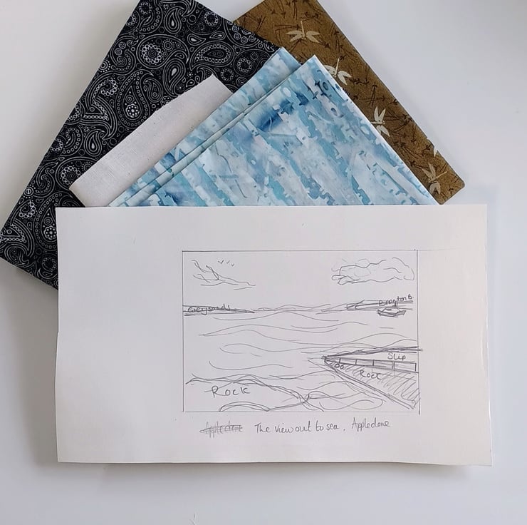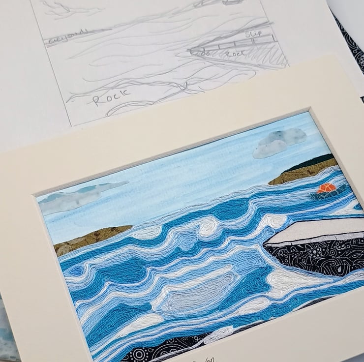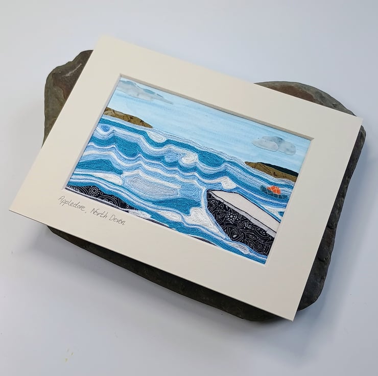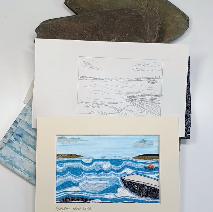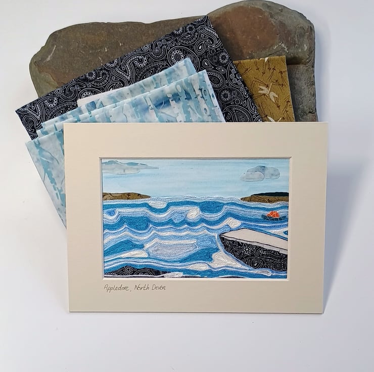 A fabric and thread collage picture captures the view out to sea from the RNLI Appledore slipway in North Devon. A blue washed sky overhead with the Mollie Hunt lifeboat anchored out in the swirling waves depicts an ever changing scene.