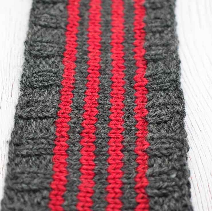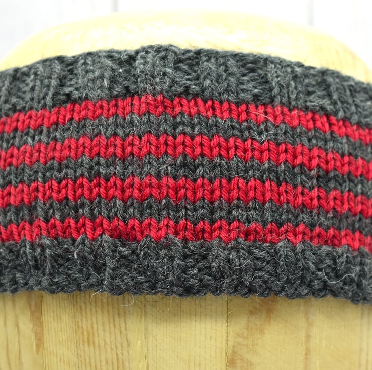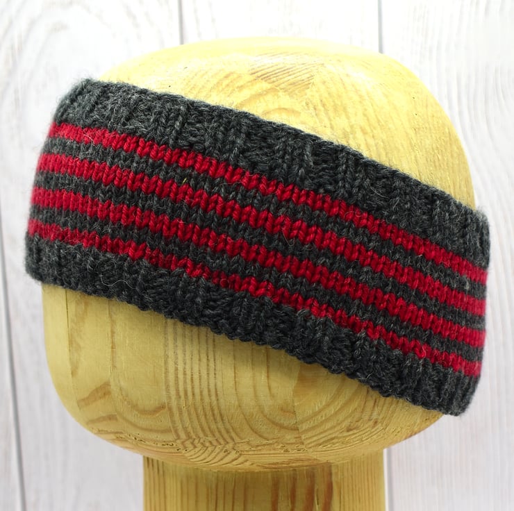 Hand knitted headband in dark grey with bold red stripes. Made using a beautifully soft cashmere and merino blend yarn, this headband is warm, comfortable, and gentle against the skin.