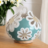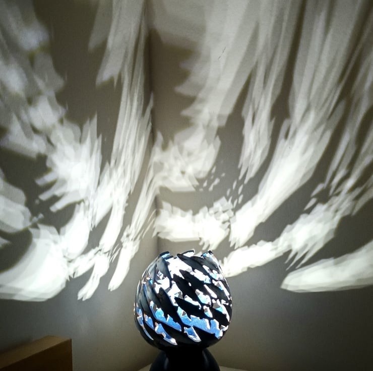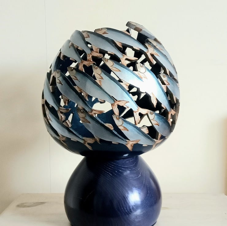 Handcarved and painted with shimmering fish, this unique piece creates a captivating display as the fish swirl around an LED light, casting enchanting shadows on your walls. Resting atop an exquisite ash base expertly turned and stained blue, this lamp stands at 25cm high by 14cm wide, making it a striking addition to any space.