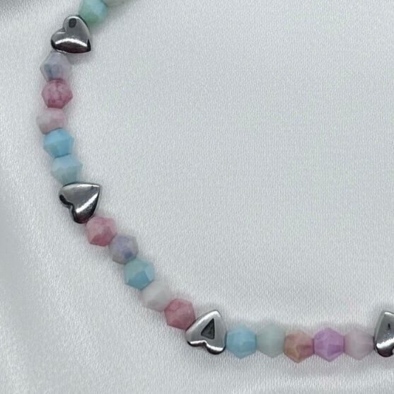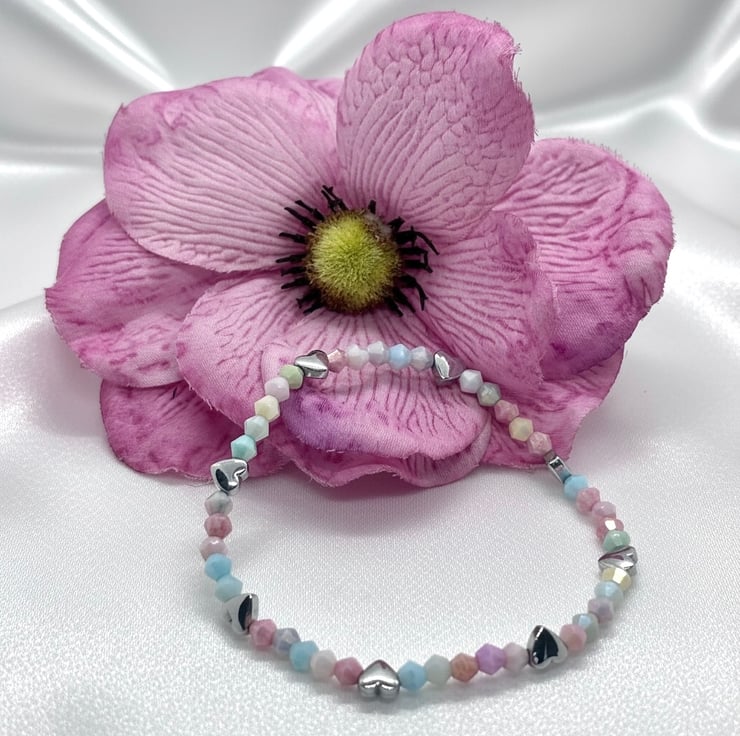 This pretty dainty bracelet has been handmade using 4mm glass crystal beads in delicate pastel shades, elasticated for comfort, it is embellished with little Silver Hematite hearts, perfect for stacking or worn alone, it will be gift wrapped for posting, please choose correct size from drop down.