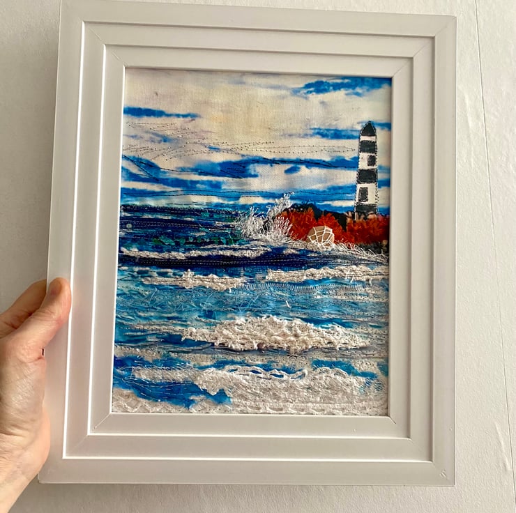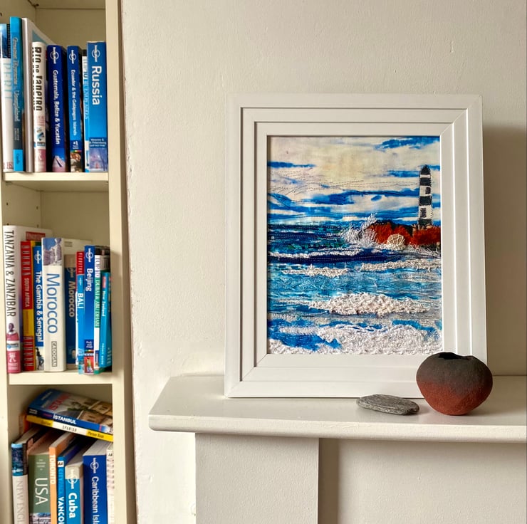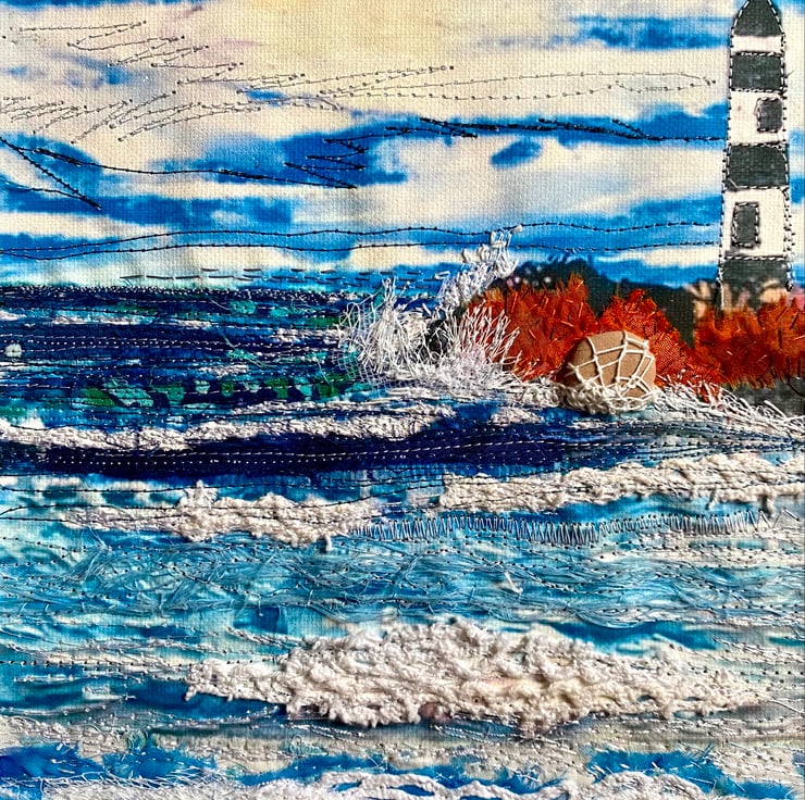 I’ve used a mix of paint, print, fabric, hand and machine stitching in this seascape. Included in the rock formation is a piece of found tile washed smooth by the sea.