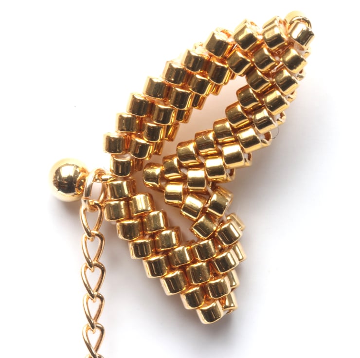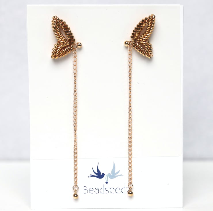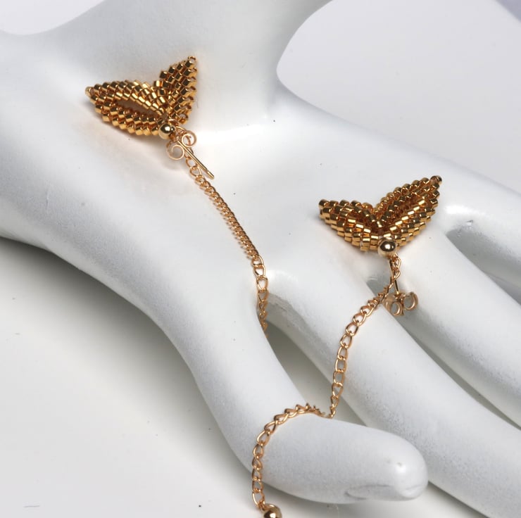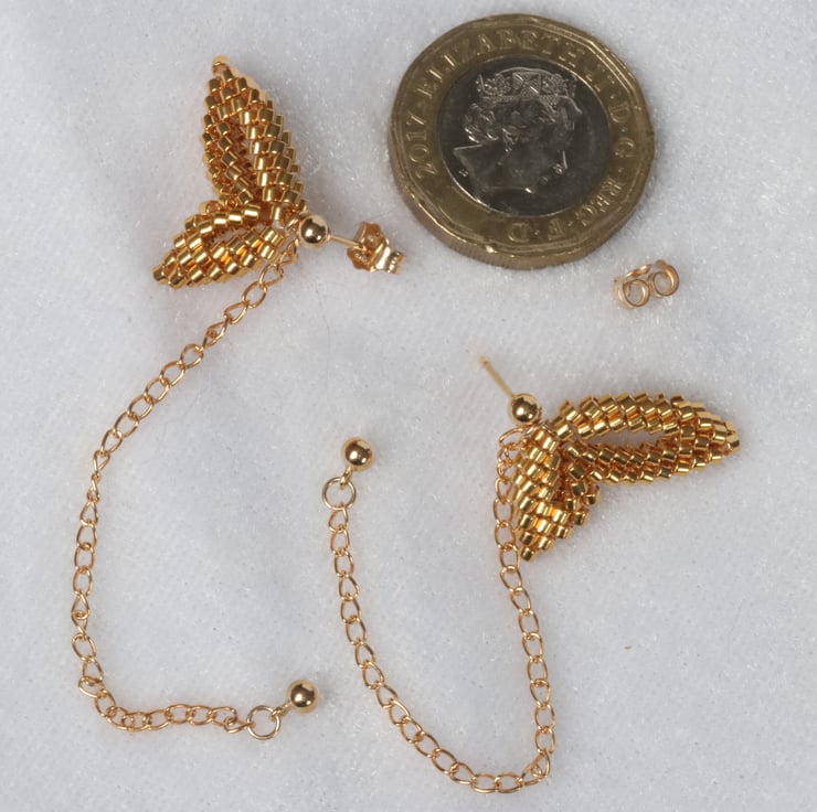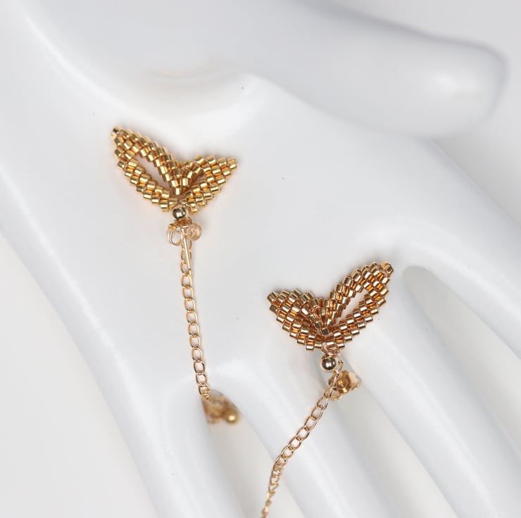 An unusual and striking earring design; these earrings are made to truly draw the eye when worn. Each earring is a pretty double-wing shape, carefully hand-sewn from tiny glass, gold-plated Delica beads.