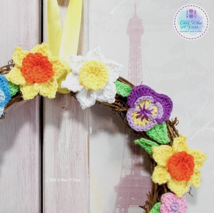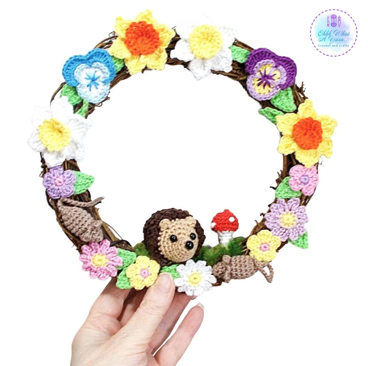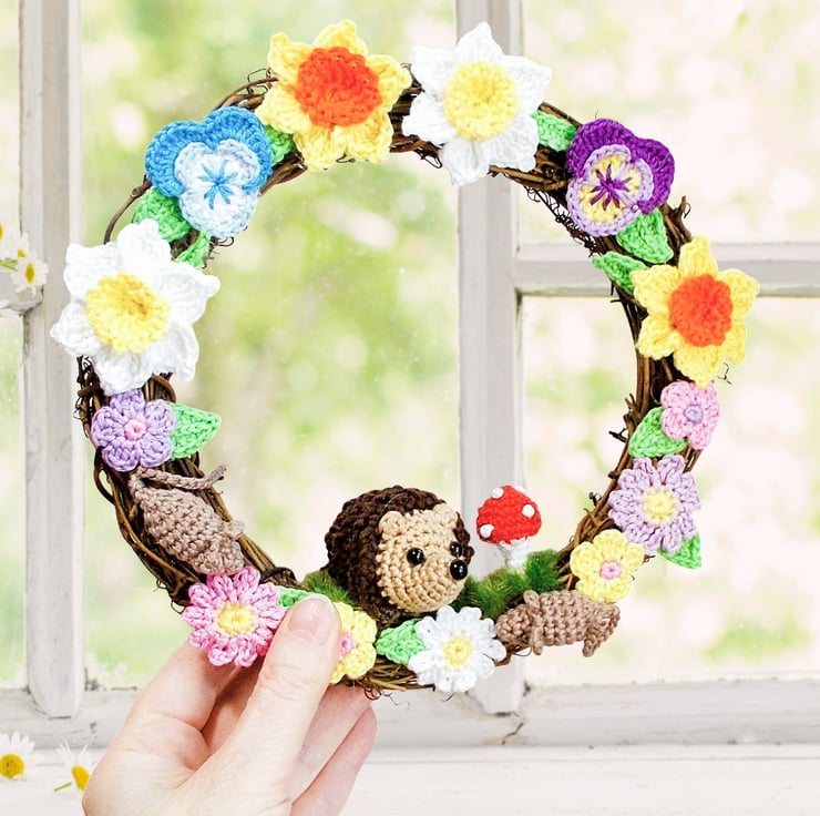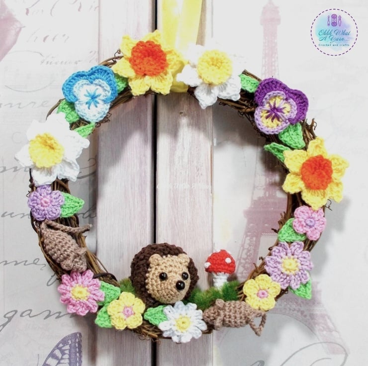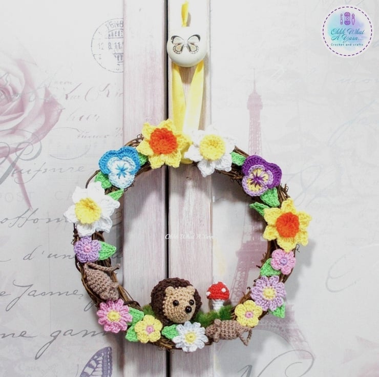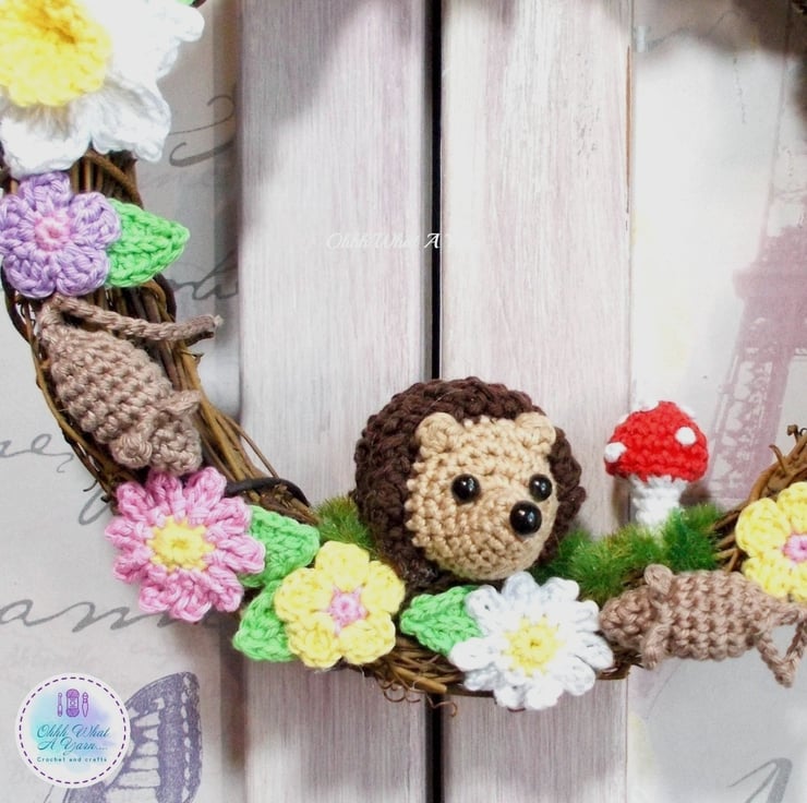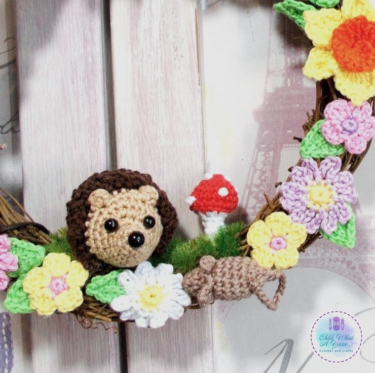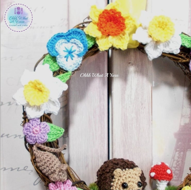 This pretty rattan wreath has been adorned with lots of my crochet work. The star of the show is the little hedgehog, and he is joined by 2 little mice, a crochet toadstool and lots of crochet flowers including daffodils and pansies and crochet leaves.