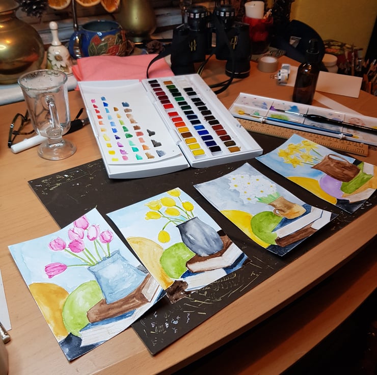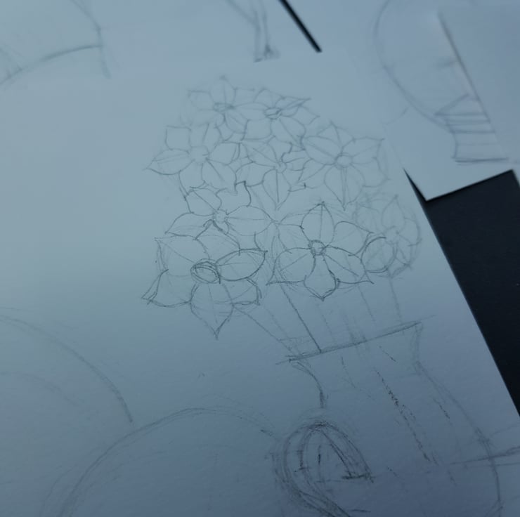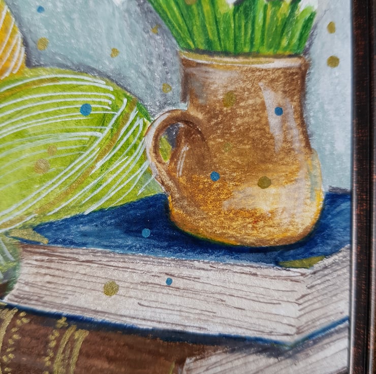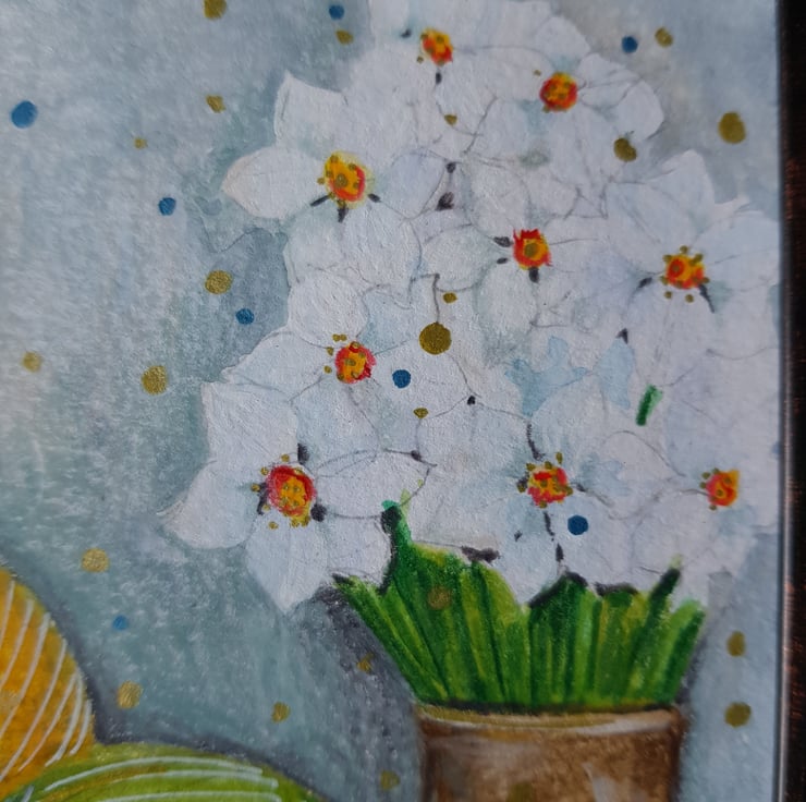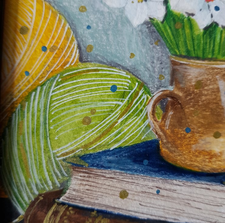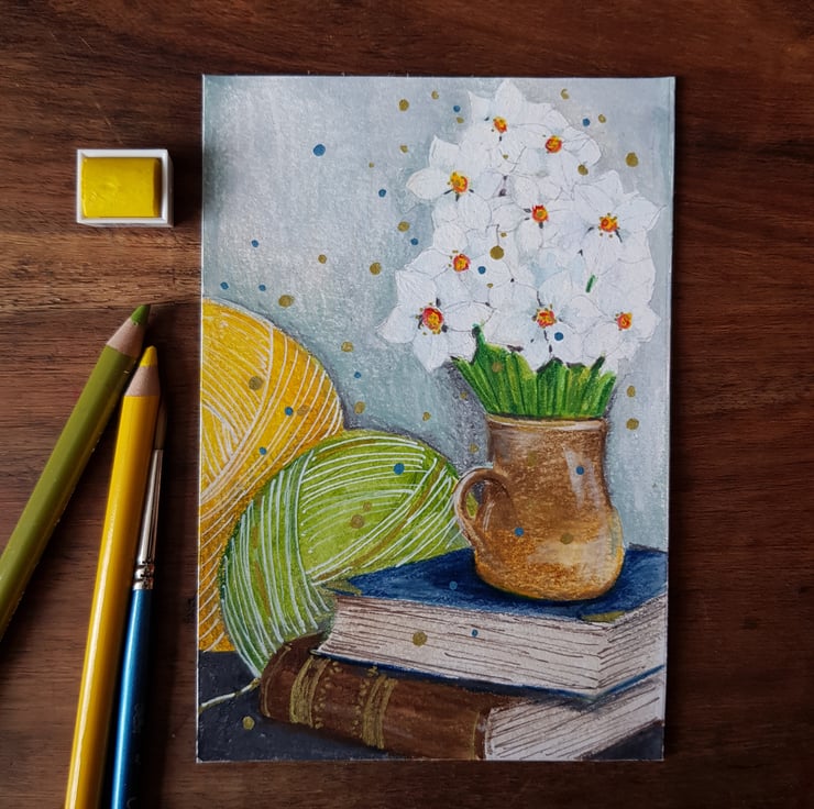 Small original artwork inspired by the delicate white Narcissus Actaea flowers emerging around the gardens. The yellows of the centres and greens of the stems are echoed by the colours of the yarn balls. Meanwhile, the textured grey background helps the delicate, white petals to stand out. By adding golden and metallic details, I gave a whimsical, magical atmosphere to my still life.