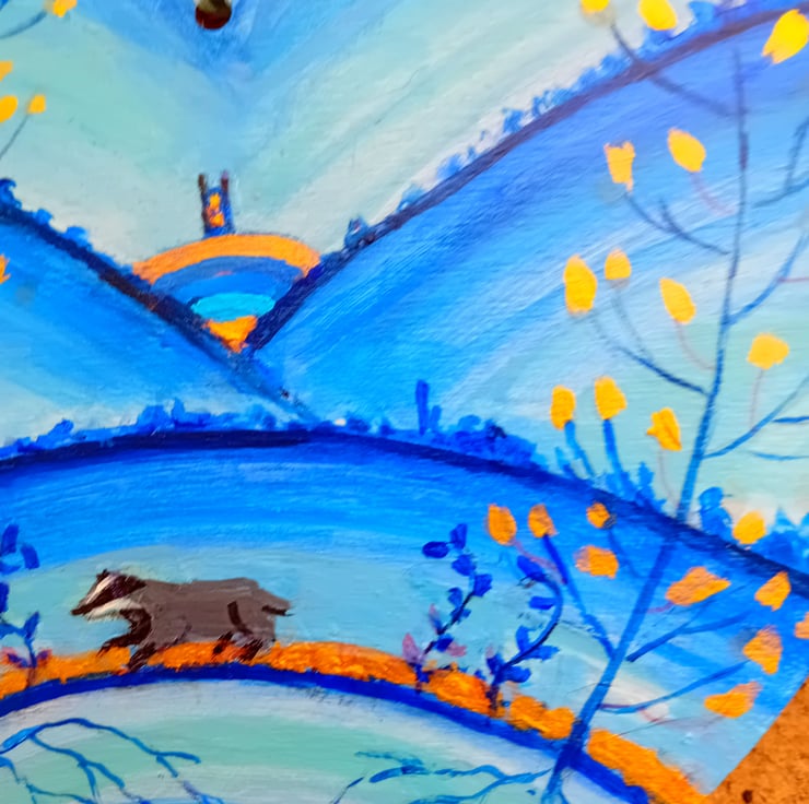 a glorious wooden heart shape .Hand painted with a moonlit landscape which shows a badger , golden leaved trees and a full golden moon 18 x 18 cm and ready to hang . a lovely gift for a special someone bringing the countryside into your home