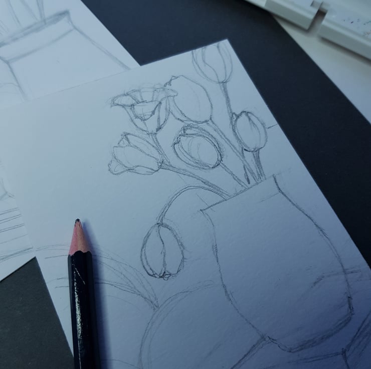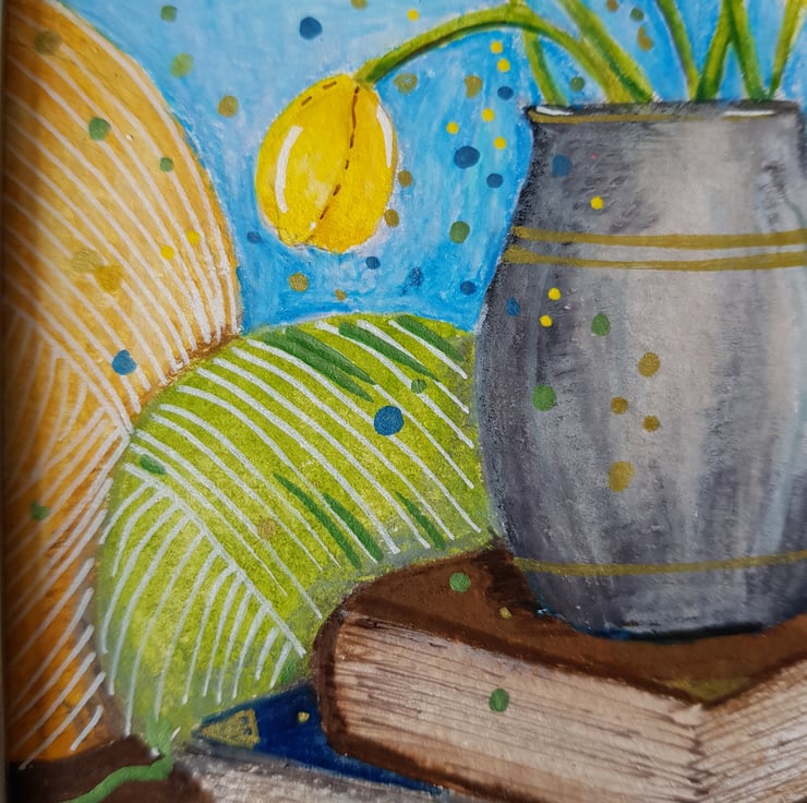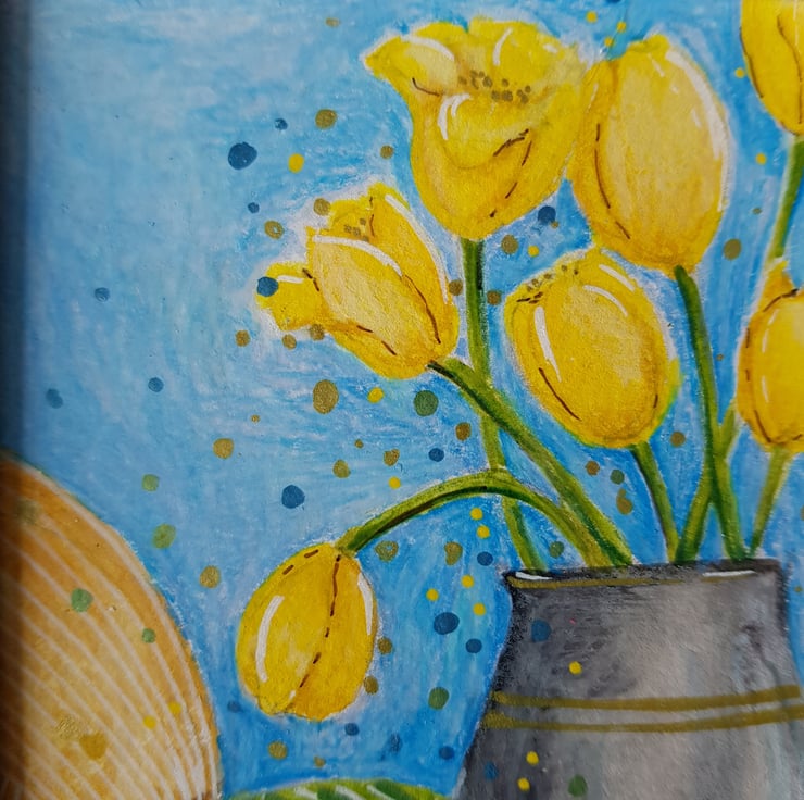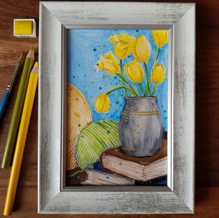 Small original artwork inspired by the cheerful yellow tulips slowly emerging around the gardens. The greens of the stems and the yellows of the petals are echoed by the colours of the yarn balls. Furthermore, the textured background and the colours of other elements included in the still life help the petals to stand out. By adding golden and metallic details, I gave a whimsical, magical atmosphere to my still life.