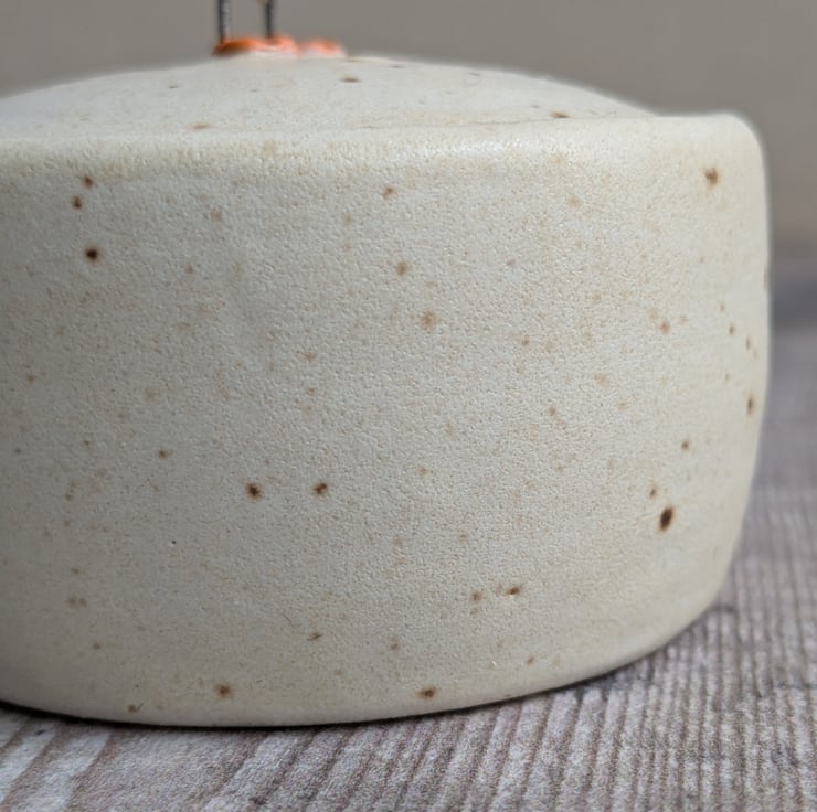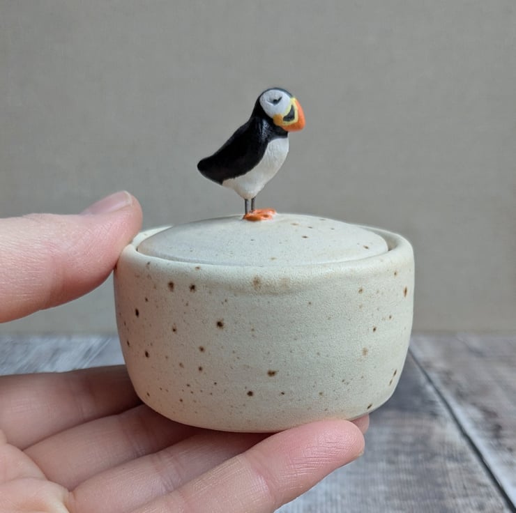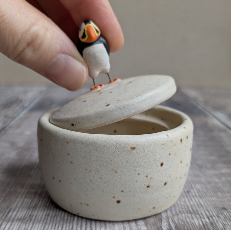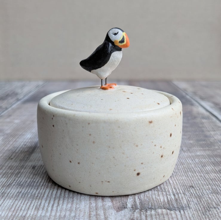 A small pot wheel thrown in white stoneware clay. The glaze is a satin cream colour with a small fleck running through it. A hand sculpted and hand painted puffin stands centrally on the lid with wire legs (do not bend, the wire can become brittle after firing).