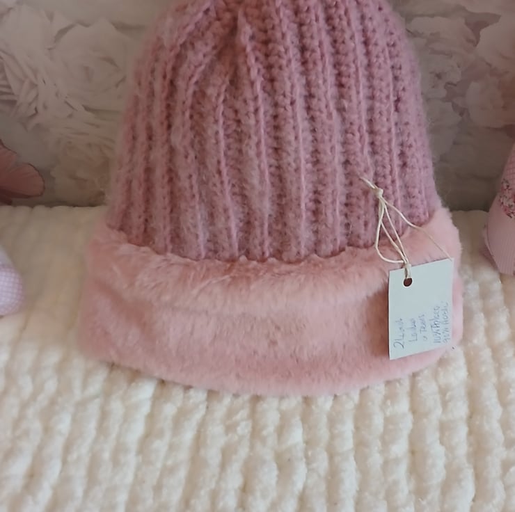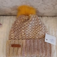 Handmade pompom crochet hat. Fur rimmed fur lined. 24 inch to fit ladies or teens. Shipping to and from UK only. All my items have full was instructions sewn in.