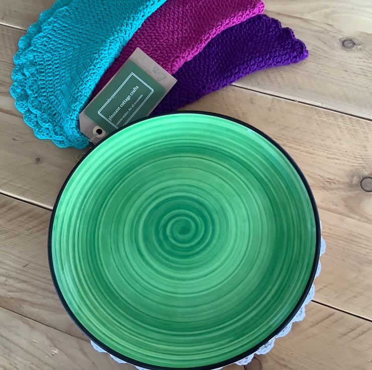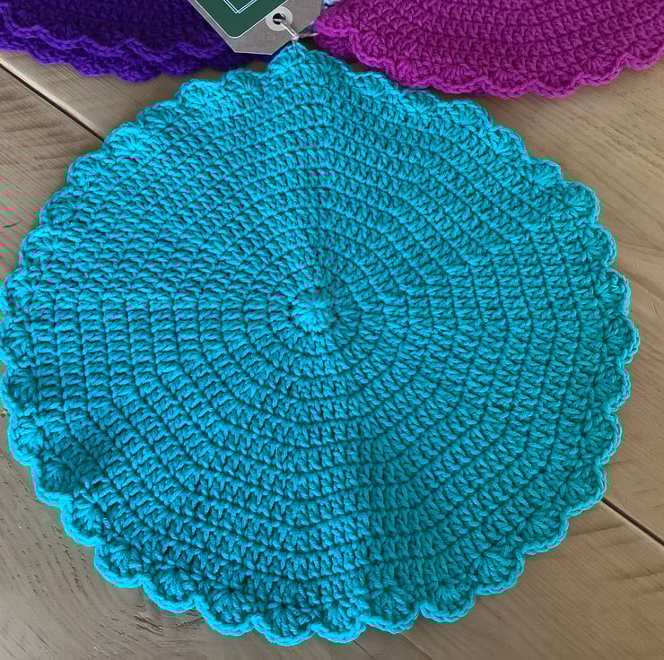 Thought the colours of the yarn would look lovely as bright easy to clean placemats and thoroughly enjoyed crocheting them