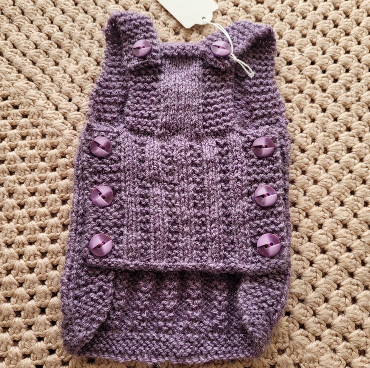 A tiny dungarees style dog coat. Hand knitted in purple fleck yarn. Size XXS. Length91/2 inches . Chest 12 inches. Would suit a small female. Machine washable on low settings.