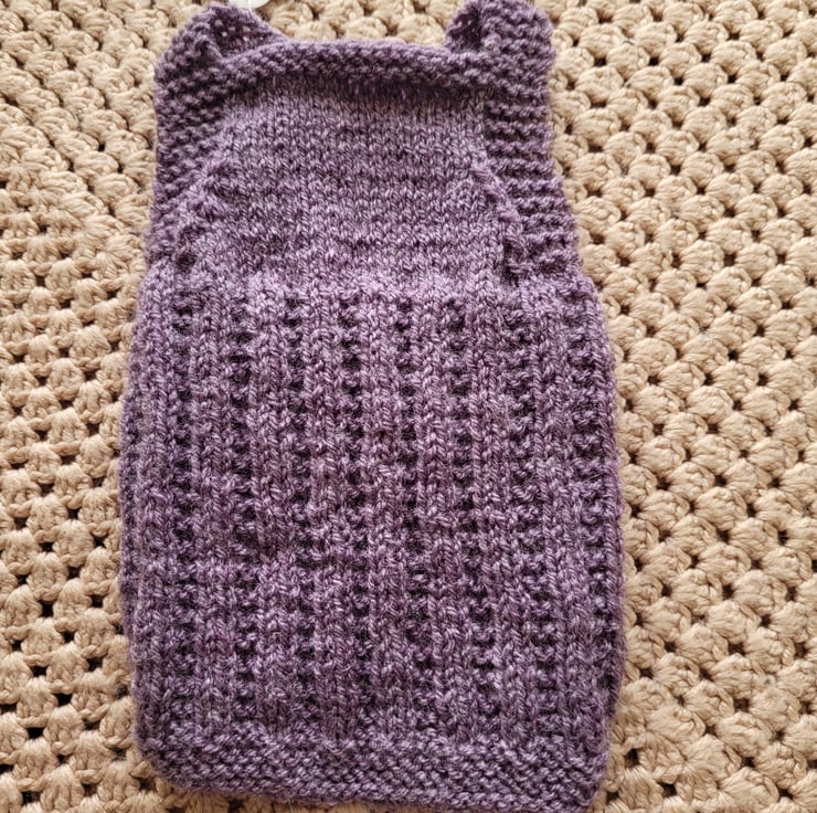 This tiny dungarees style dog coat is one of my smallest knitts. Last but not least . The dence appearance os the yarn makes the pattern stand out. Complimented by the two tone purple buttons