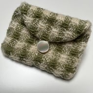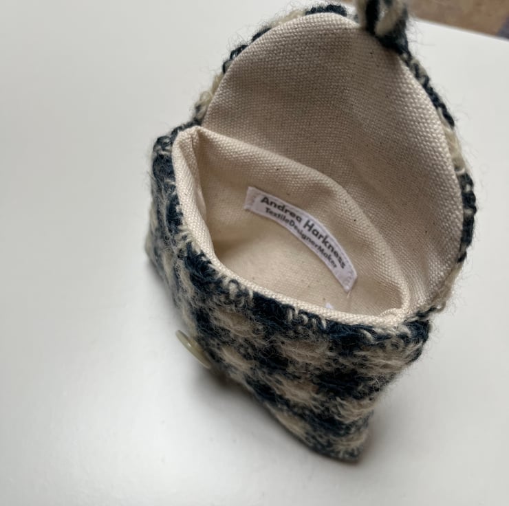 A lovely little purse featuring my handwoven lace weave in the Maja design and Bluefaced Leicester yarn. The lining is cotton and the button is antique Mother of Pearl. Suitable for odd coins, bank type cards, crystals and keepsakes. 8cm x 11 approximately.