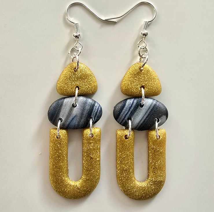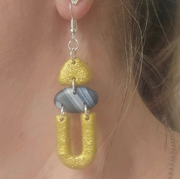 A pair of dangle earrings lovingly made with polymer clay. All earrings come on silver plated ear hooks and are presented in tissue and in an organza bag ready to gift to yourself or someone else. The drop of the earrings measures approx 5cm from the bottom of the ear hook.