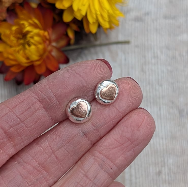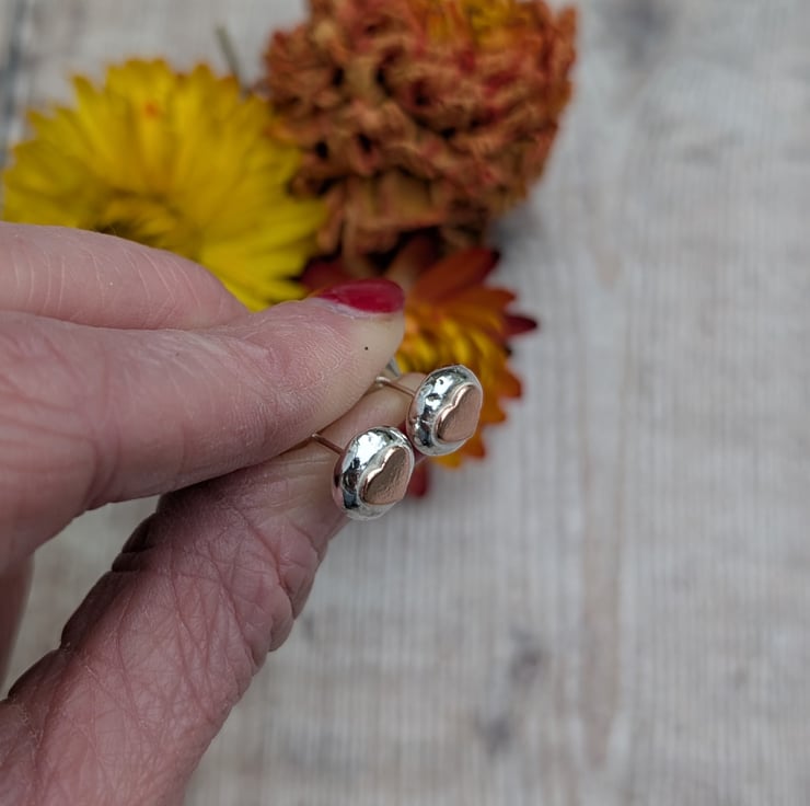 These Silver Pebble Stud Earrings with Copper Hearts are handmade using recycled sterling silver, shaped into softly rounded pebble forms. Each stud features a warm copper heart set into the surface, creating a gentle contrast between the cool silver and the rich copper tone.