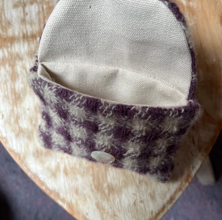 A lovely little purse featuring my handwoven lace weave in the Maja design and Bluefaced Leicester yarn. The lining is cotton and the button is antique Mother of Pearl. Suitable for odd coins, bank type cards, crystals and keepsakes. 8cm x 11 approximately.
