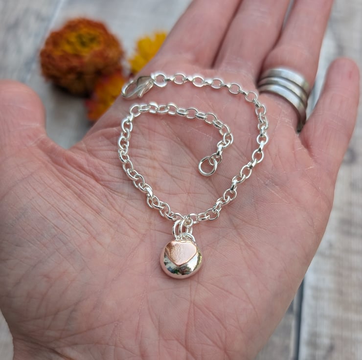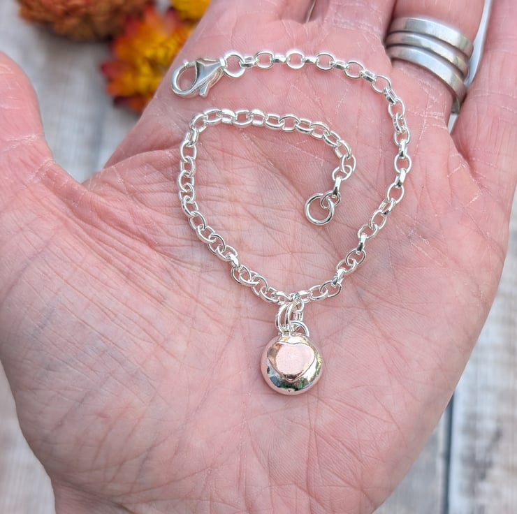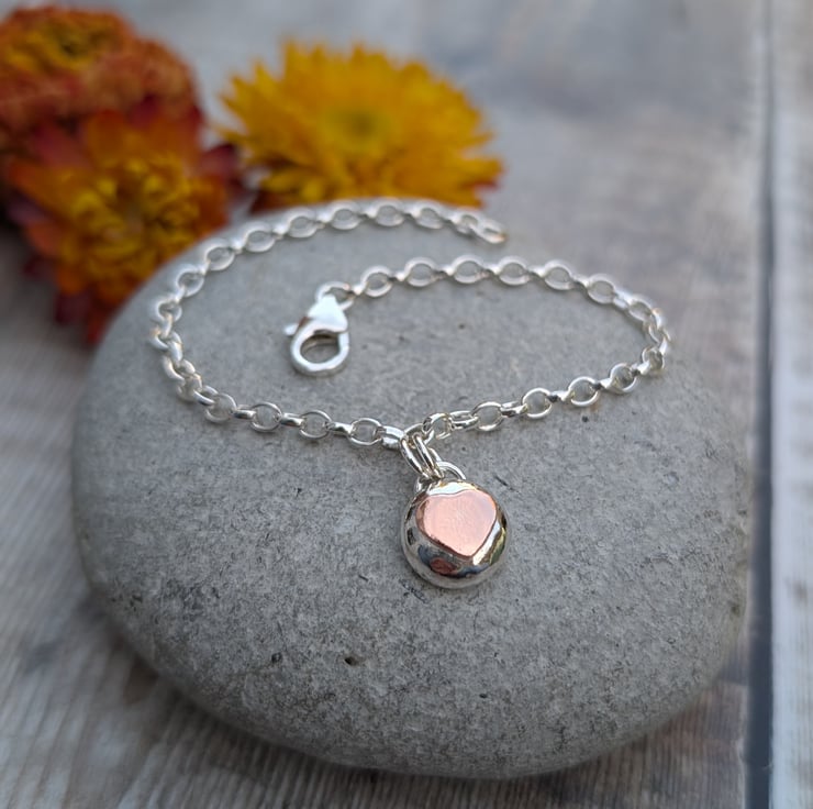 Gorgeous silver bracelet with a silver pebble and copper heart charm made from a recycled Sterling Silver chain. Each pebble is formed by hand by melting down pieces of Sterling Silver into a pebble shape which has then been filed and polished.