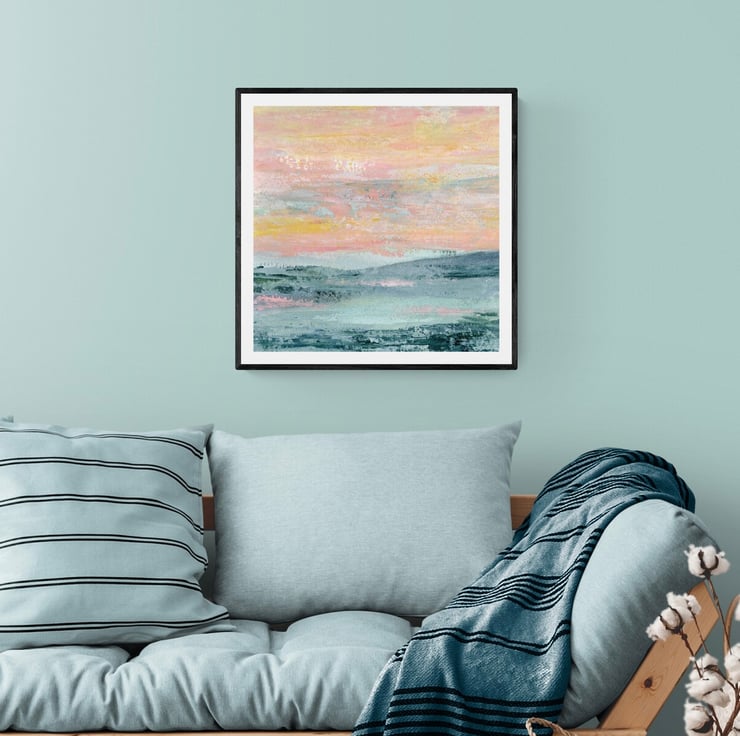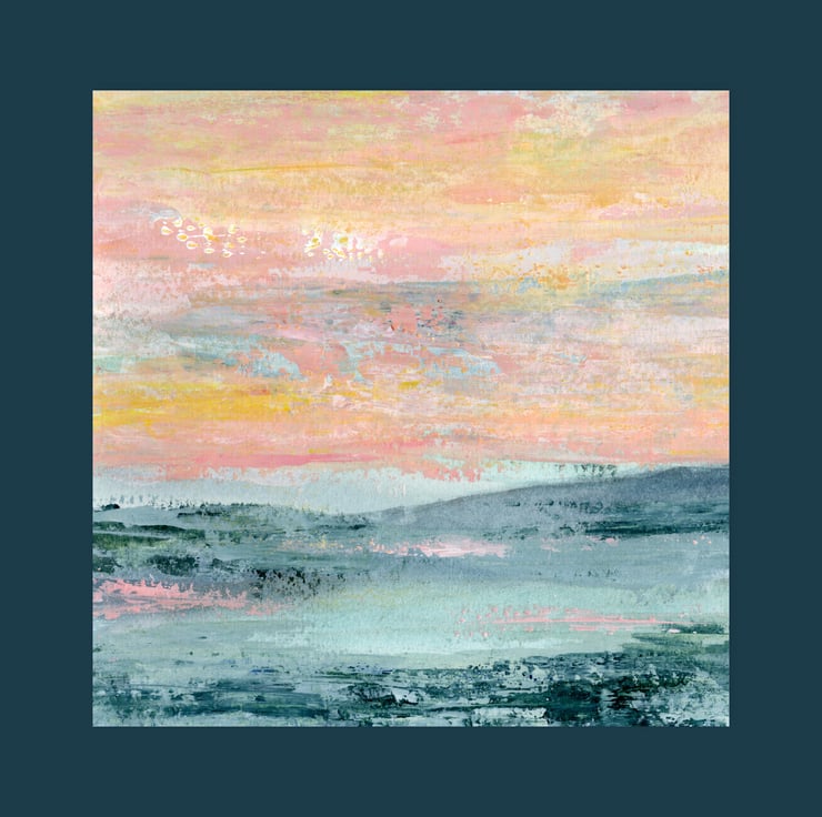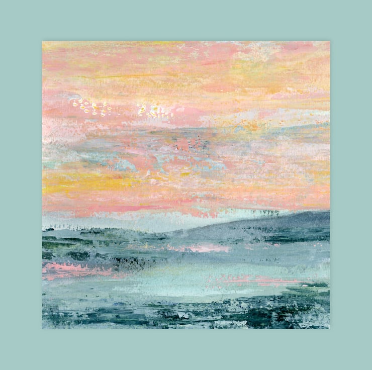 ‘See the Glimmers’ print of acrylic & watercolour semi abstract seascape art. The ‘Dreamy Seascapes’ collection is inspired by those walks by the sea when the sea feels almost dreamlike with beautiful aquamarine waves and a shimmer dancing across the waves.