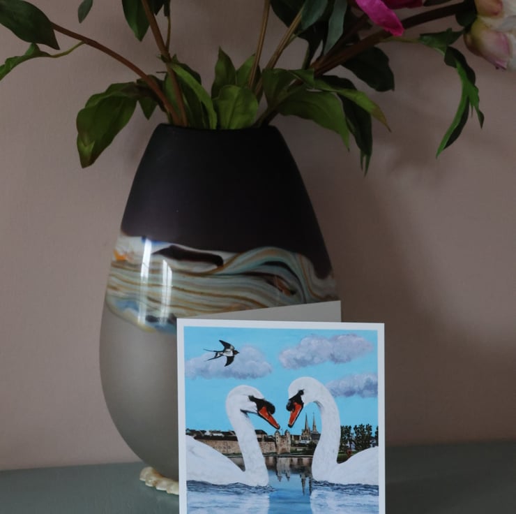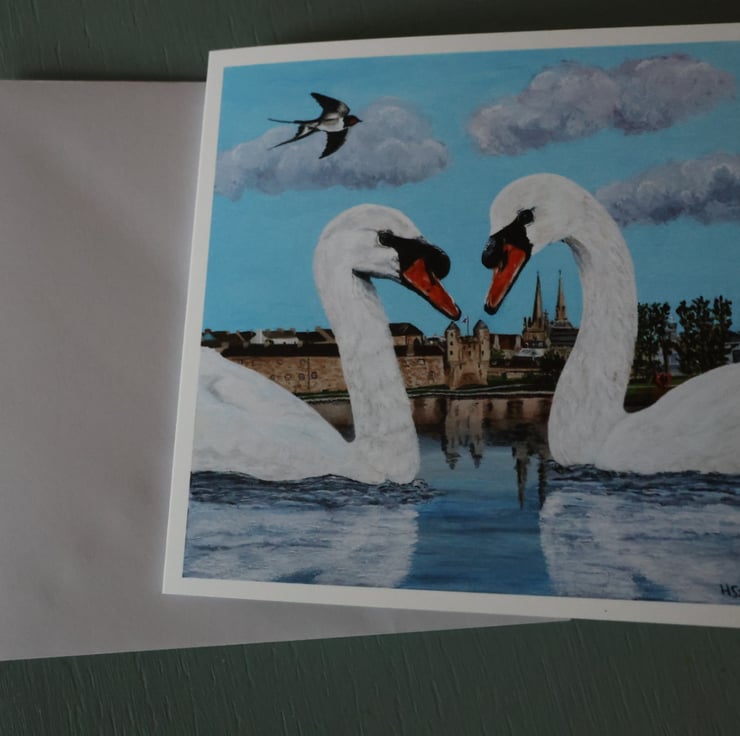 This beautiful greetings card is taken from my original acrylic painting. It features two Mute Swans on the Erne with the stunning backdrop of Enniskillen including three Churches, the Castle, the Heart of Enniskillen and Cole’s Monument and a Swallow flying overhead.