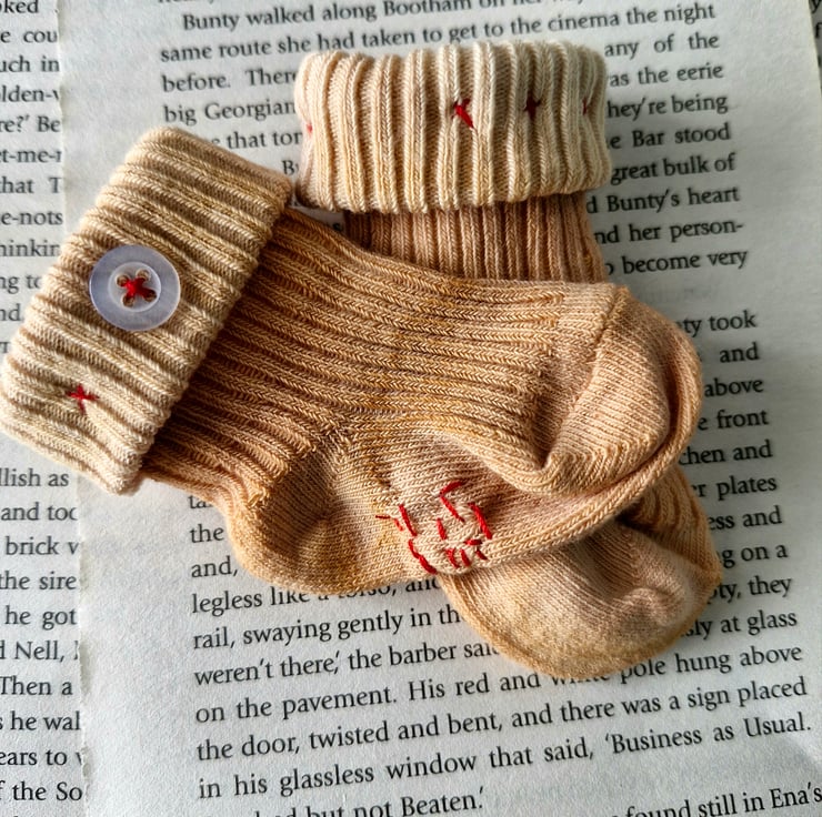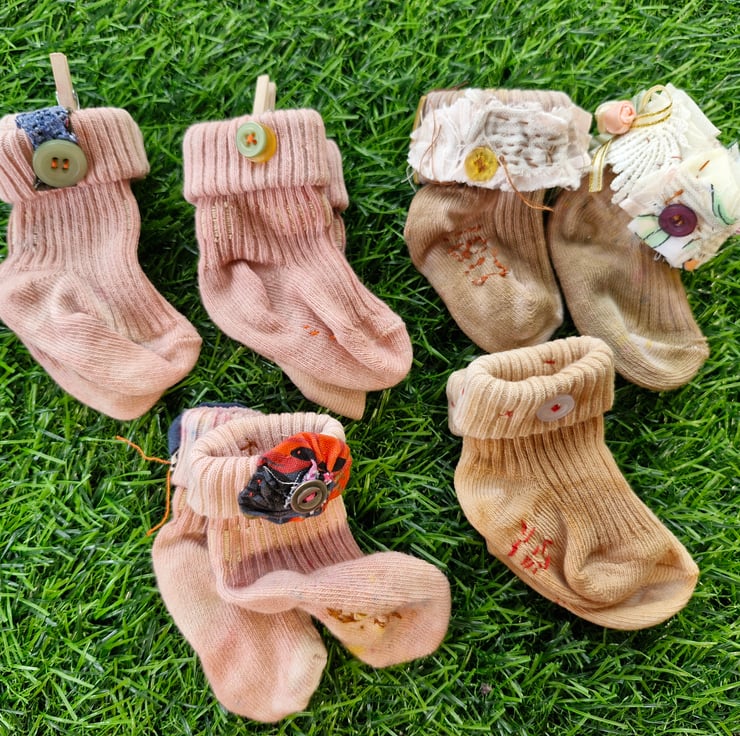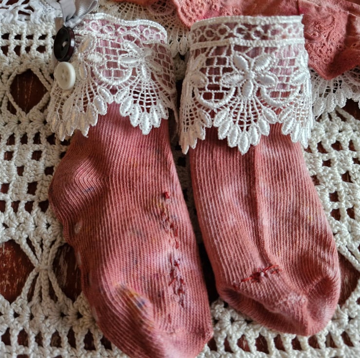These aren't any tiny bits of footwear; they are the result of a quiet afternoon, and some hand made natural dye and a very dedicated set of hands. Here is the story of the Honey- Ribbed Adventurers. Once upon a time. these socks were nothing more than a pair of bright white plain socks who dreamed of becoming something much more interesting. These socks wanted to protect the smallest, most adventurous toes in the world.