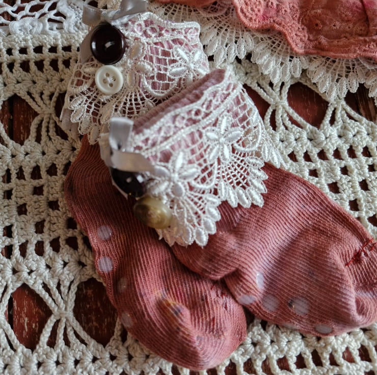 These vintage style baby socks are the definition of "heirloom charm" the standout feature is the side -button detail. Two mismatched or functional looking buttons are sewn onto the outer ankle, adding a touch of sophisticated, old-world craft. These socks are high cuff that can be worn pulled up or folded over, providing extra warmth. Available in a variety of shades of pink or brown. Embellished with lace and buttons and hand sewn embroidery. Size 0-3 months