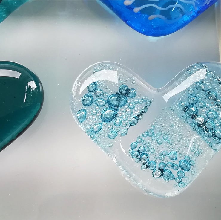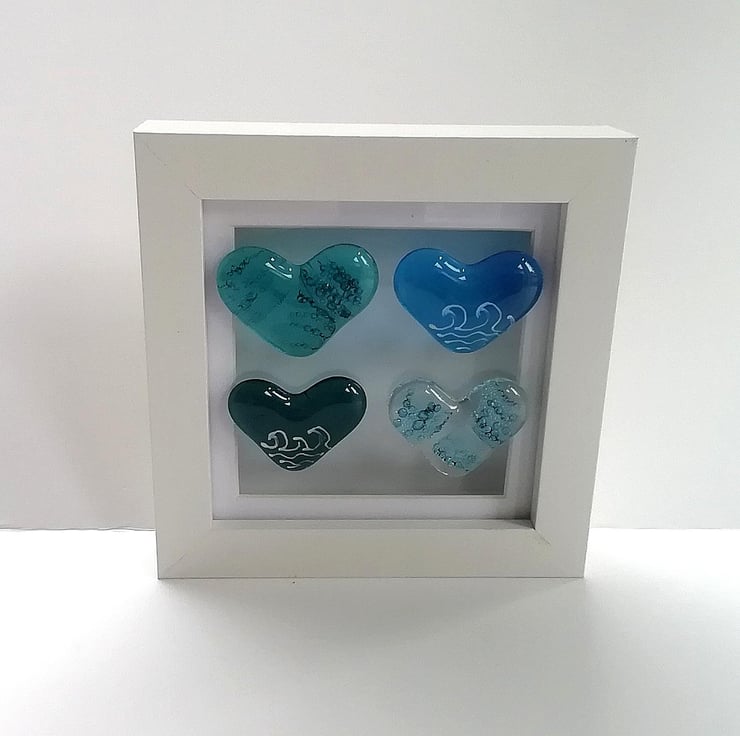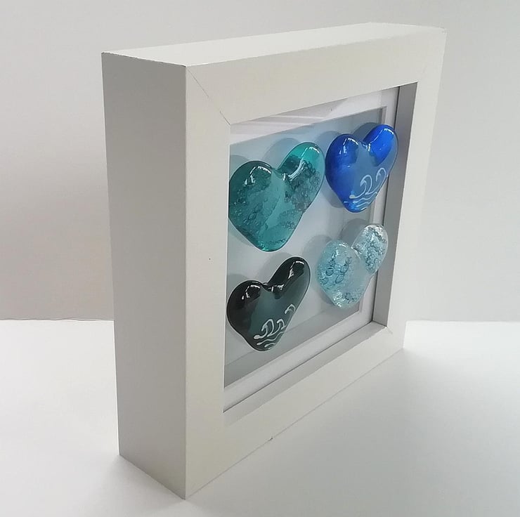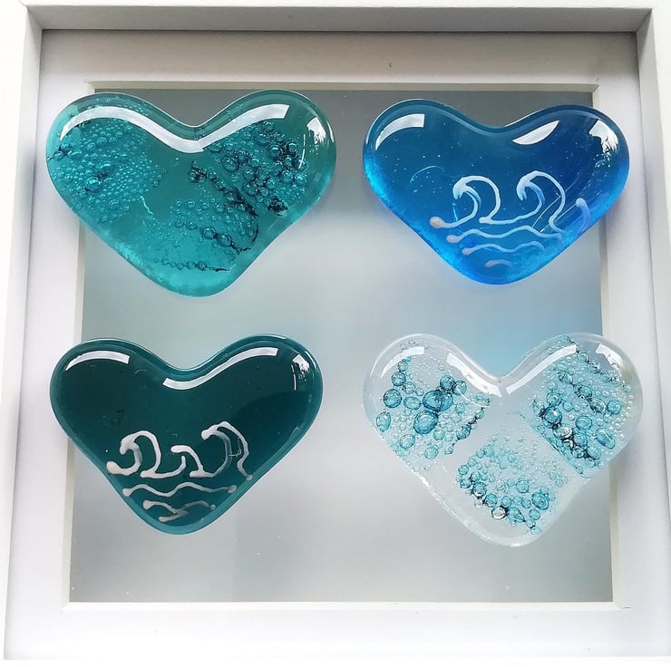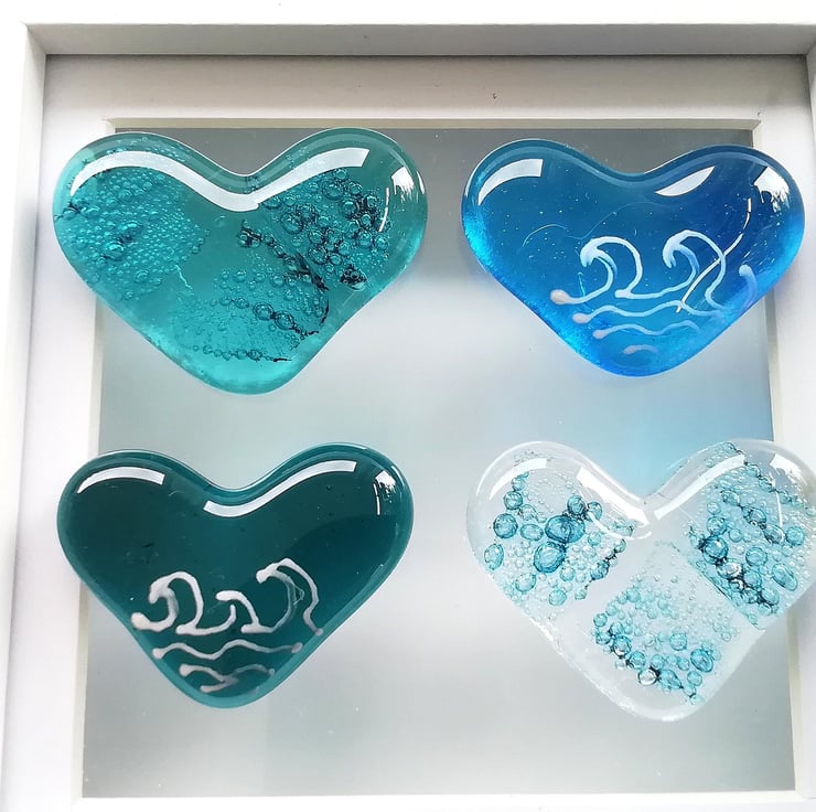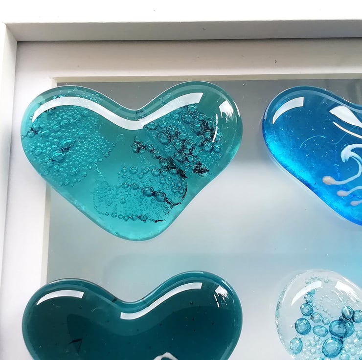 I made waaaaay too many hearts for this project which is why I've listed some as pocket hearts. I hand cut the hearts and fuse, trapping bubbles inside two of them. Once cool I attach them to the shadow box frame with strong clear Silicone. A lovely beachy framed piece of art.