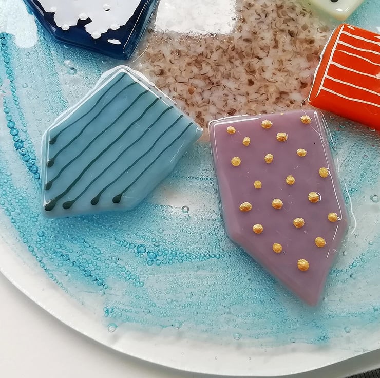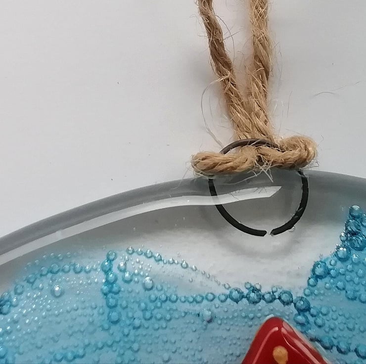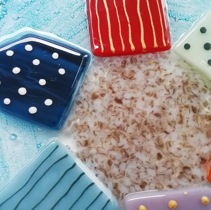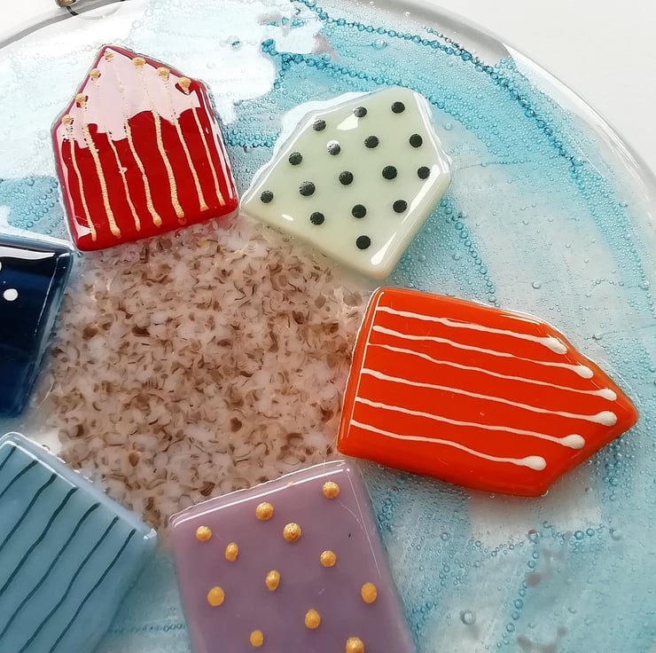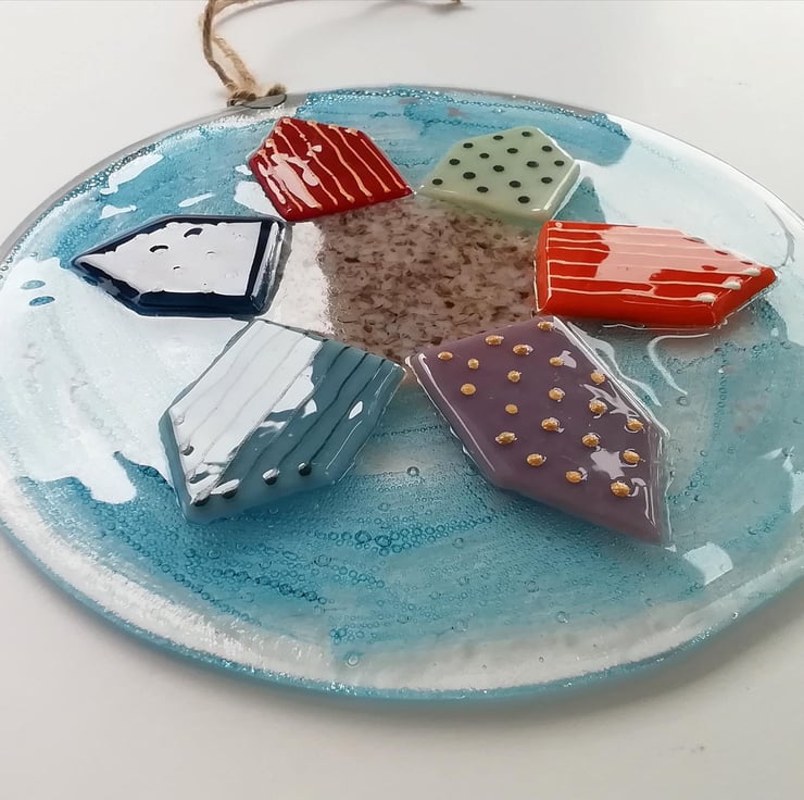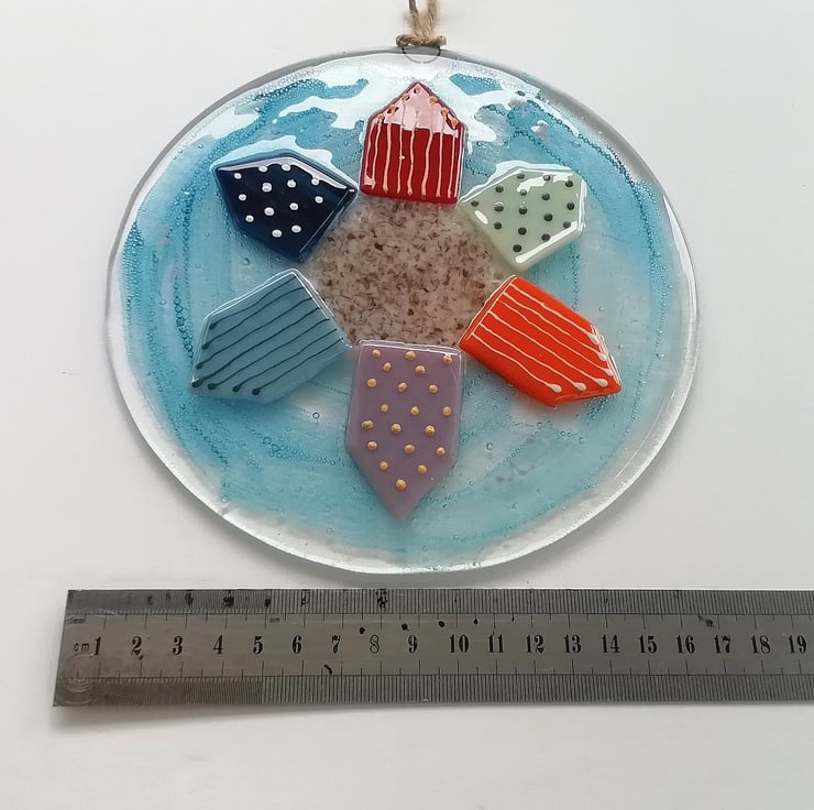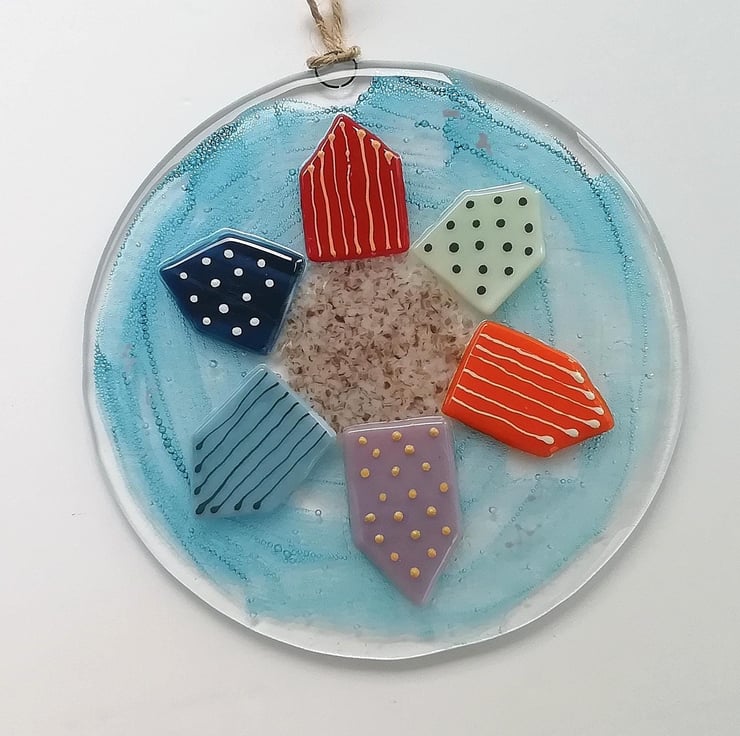 A lovely substantial piece of wall art, perfect in a nursery or as kitchen decor. I hand cut my glass, I've trapped blue bubbles within the glass which gives the piece a lovely depth. I've used crushed glass and glass enamels for detail. A bright colourful piece to hang on your wall measuring 18cms diameter with twine to hang. It's had two fusings, the second retains texture of the beachhuts.