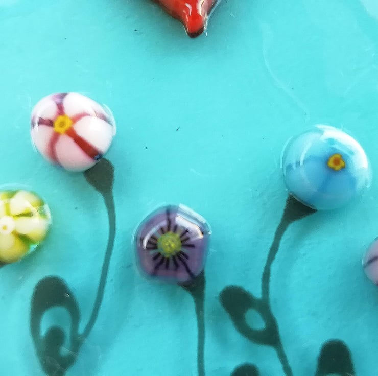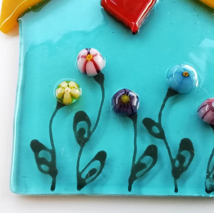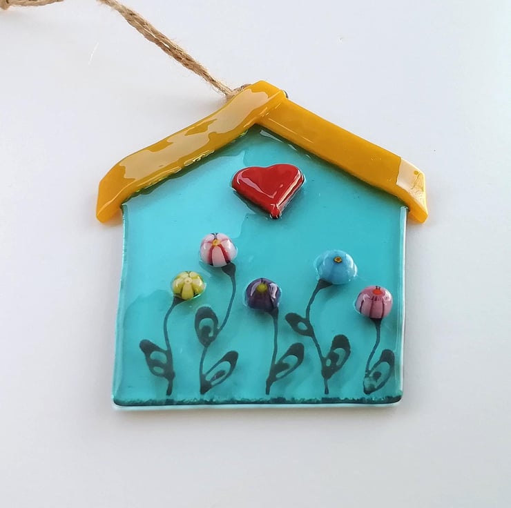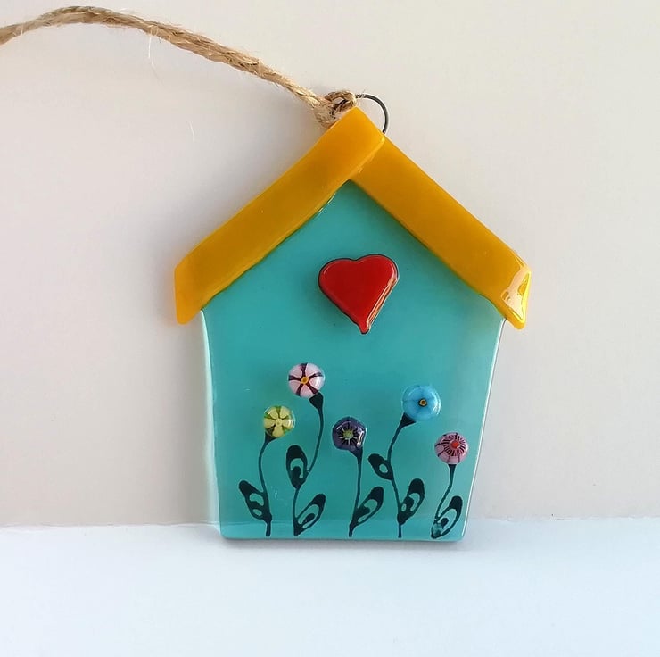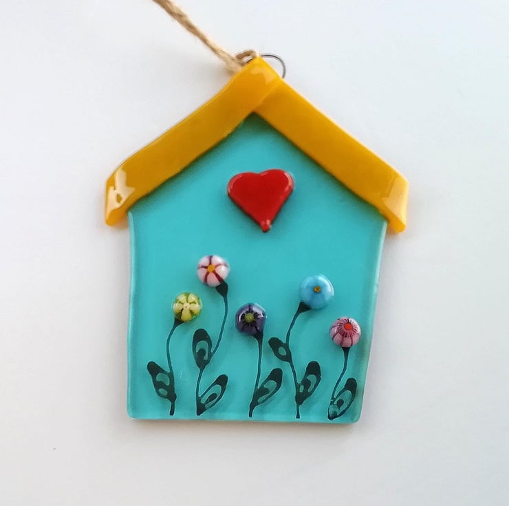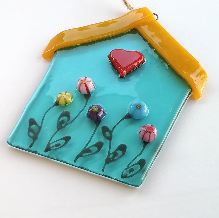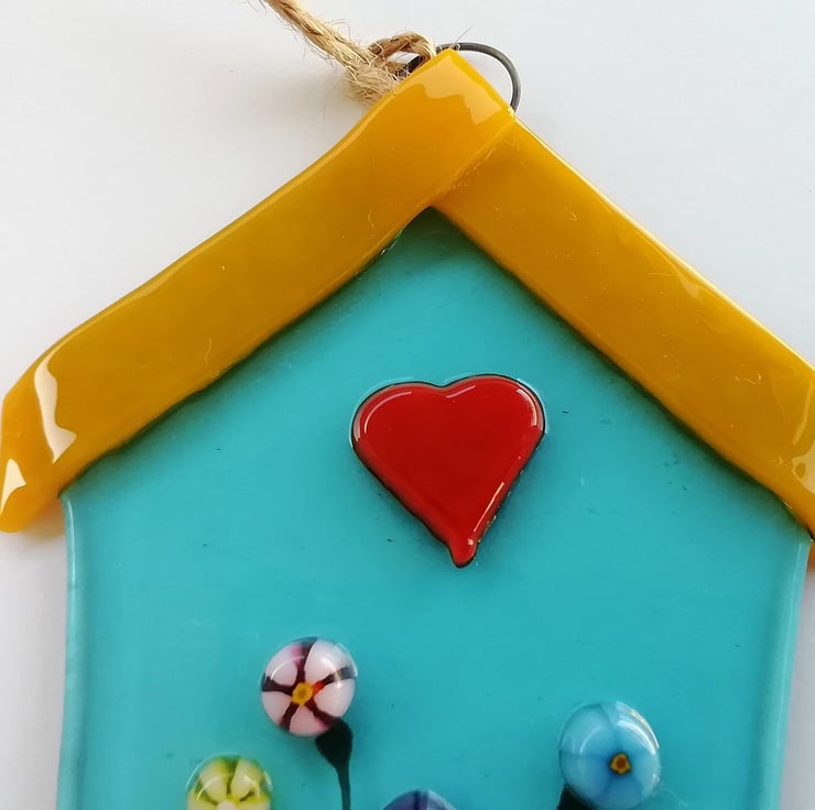 A lovely little birdhouse hanger, I hand cut my glass and hand draw with glass enamels which gets fused into the glass. I've used tiny murrini flowers and fused them with the glass. A lovely red heart creates the final touch and once cool I attach twine to hang.