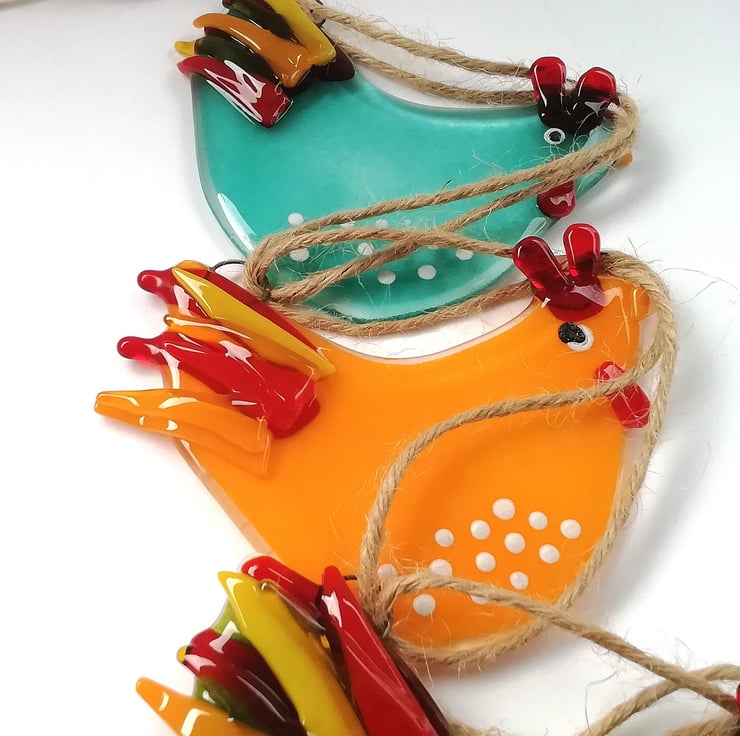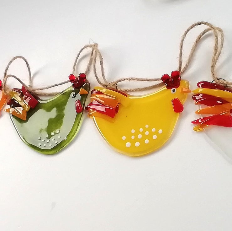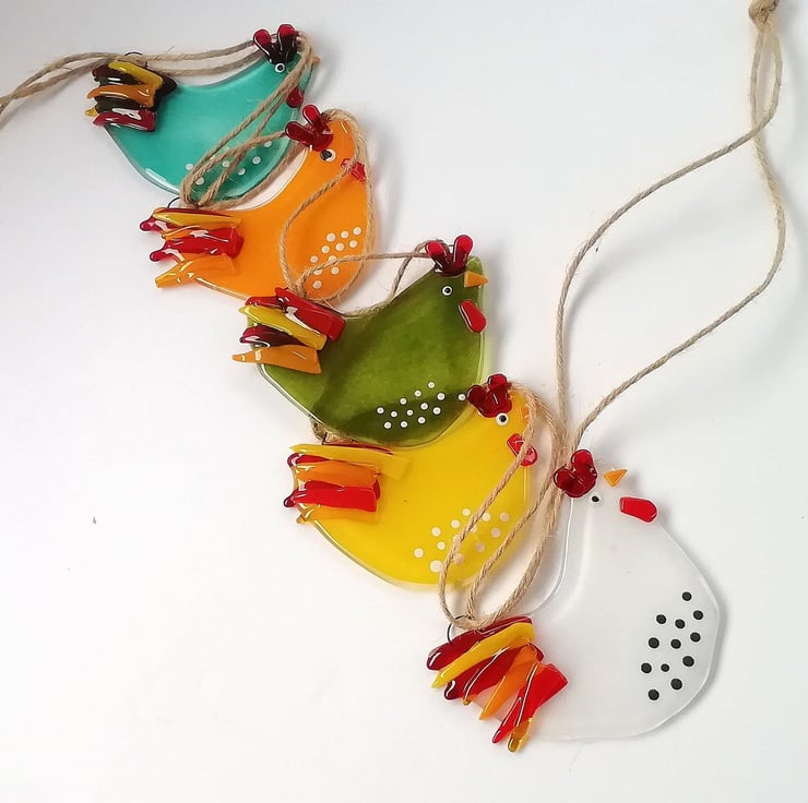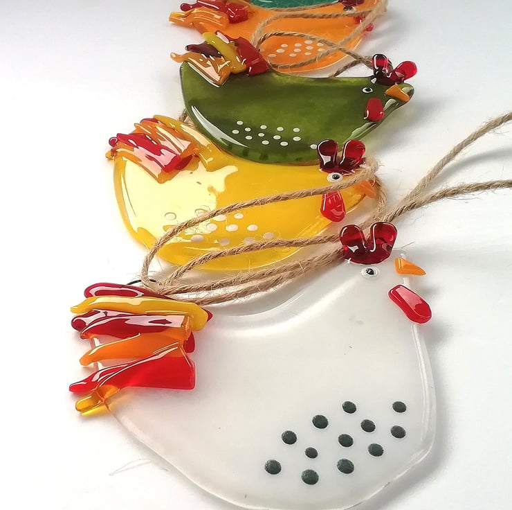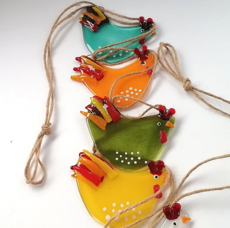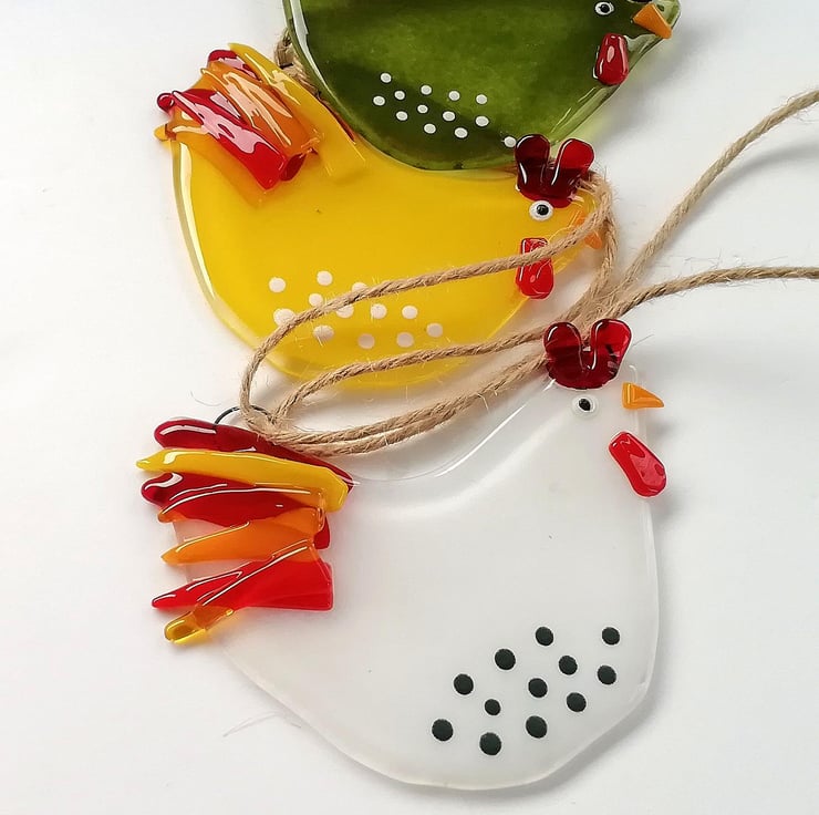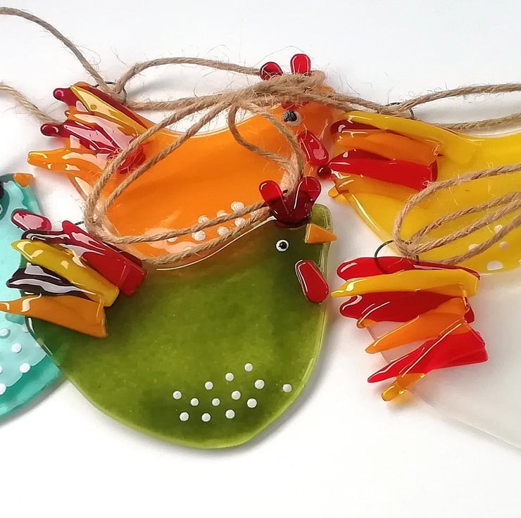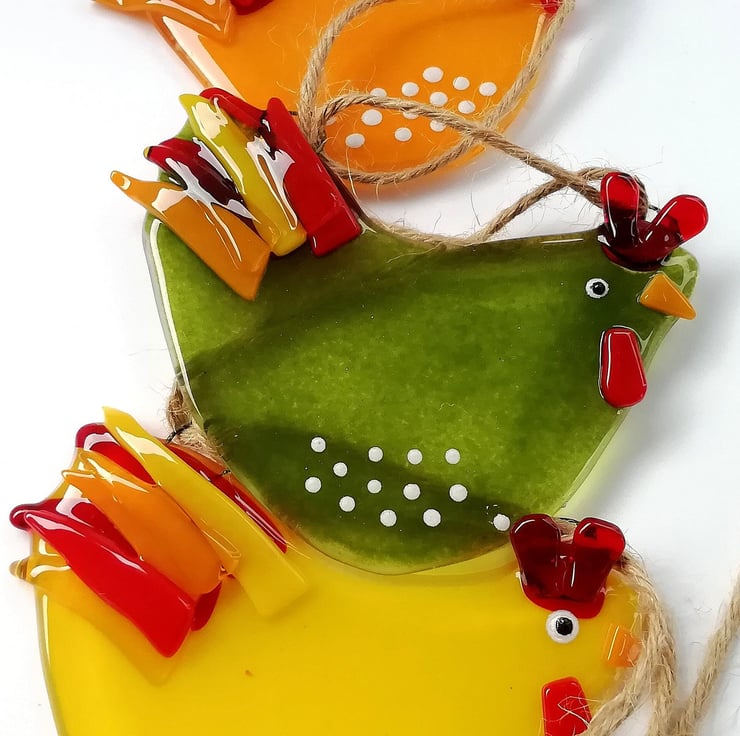 Handmade by me and fused in my home studio. I hand cut my glass, each tail feather is nipped into shape by hand. I colour the chickens with powders and then fuse them. The second visit to the kiln is the tiny addition of the details such as beaks, eyes and feathers. A really unique addition to your kitchen decor.