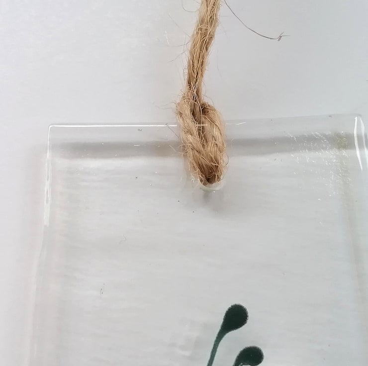 This is a perfect small suncatcher that's ideal for a little token gift. I've handcut the glass and fused it in my kiln. Each tiny petal is nipped into shape. I've used glass enamels to pick out the detail of the stalks and crushed and powdered glass. Once cool I add twine to hang. Price is for one.