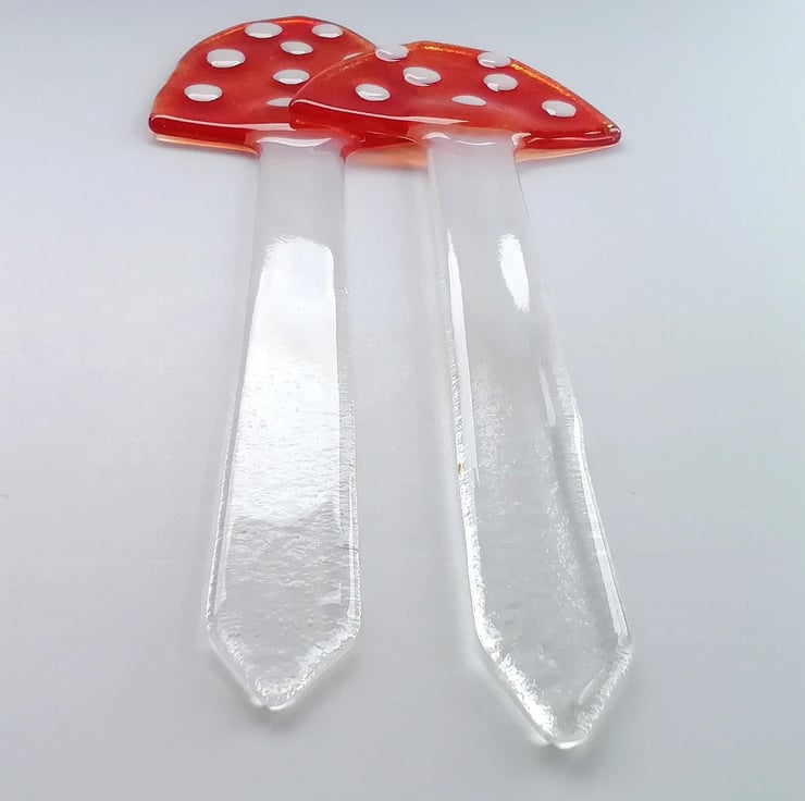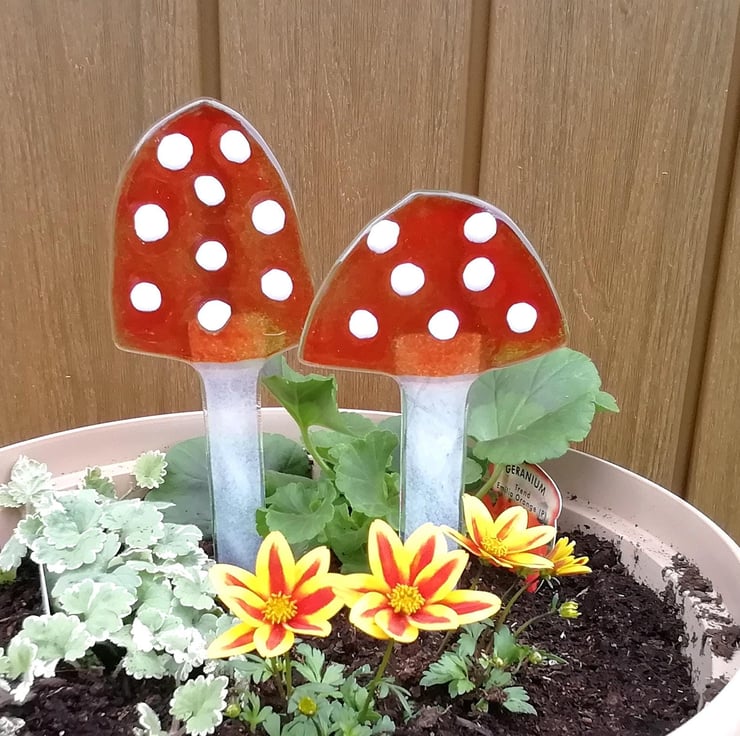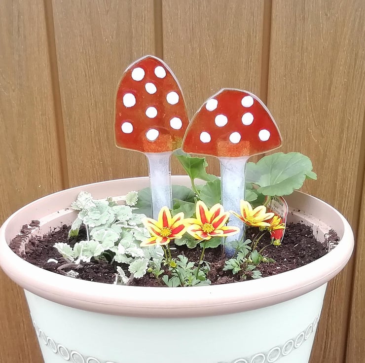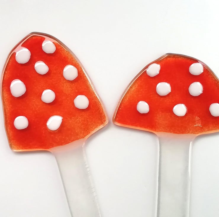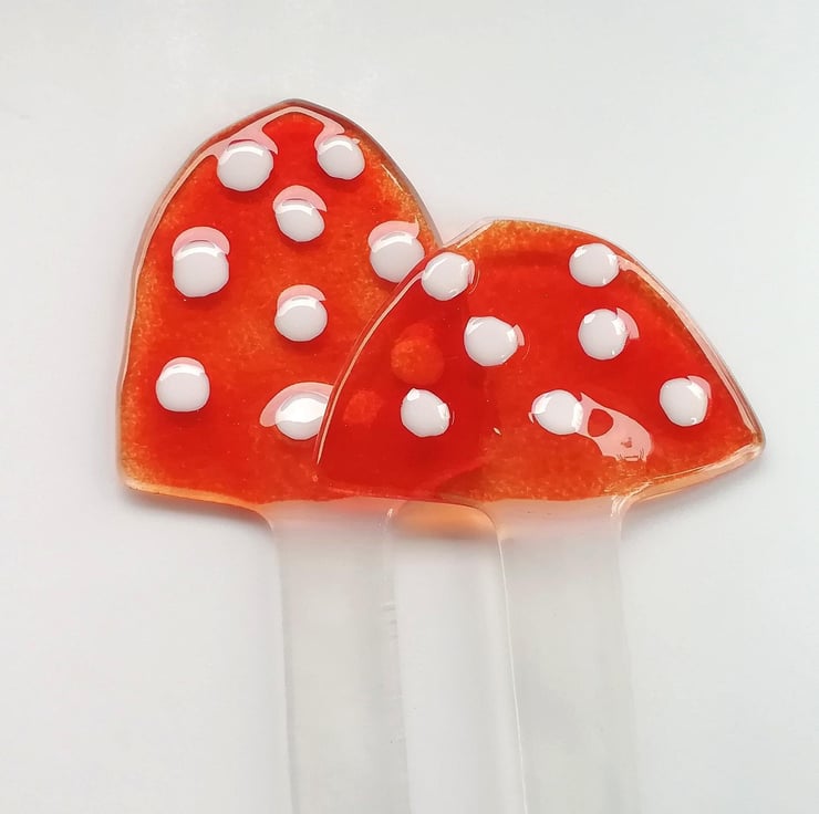 Lovely bright colourful toadstools for your garden patio plant pots. I hand cut my glass and colour it with powders and crushed glass. I fuse them at a temperature of 800 .A set of two slightly different shapes. This is a lovely gift for the garden, gently press into loose soil and they'll happily withstand british winters.