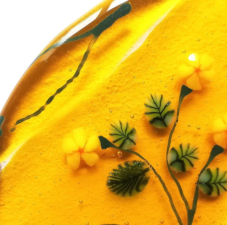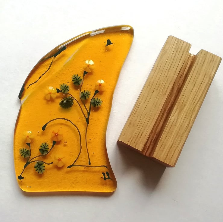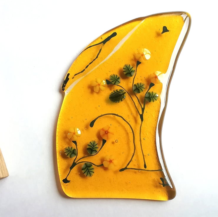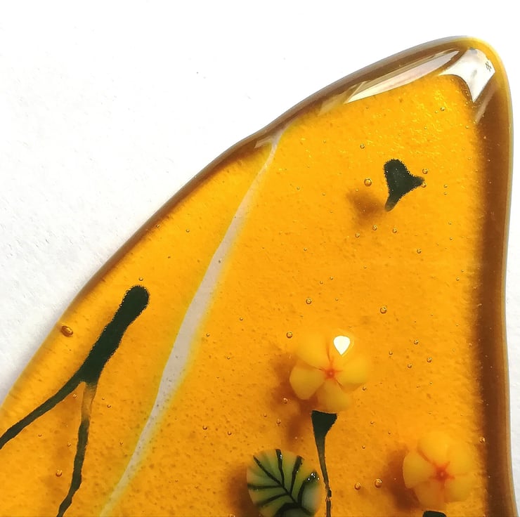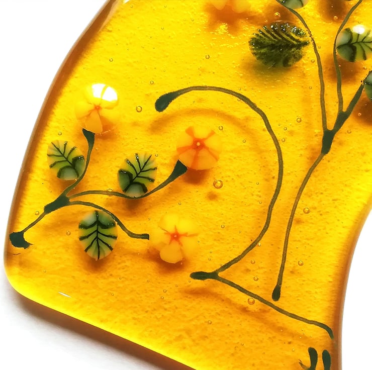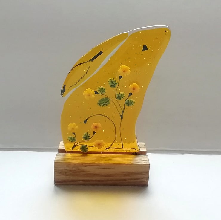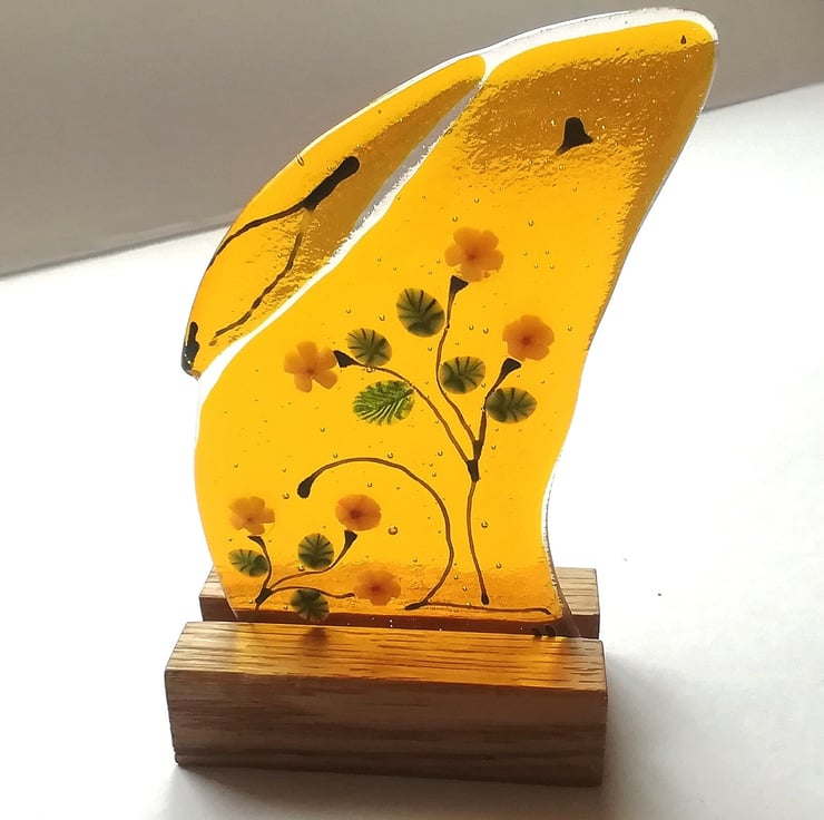 New to my Luna collection, a new golden moongazing hare for autumn. I've handcut the lovely golden yellow glass and used murrini yellow flowers, and late summer sunflowers and leaves and glass enamels for the details of the hare. It has a real folk art feel about it and such a summery feel. He stands in a little wooden stand and is perfect on a shelf or sunny windowsill. Moongazing hares are so magical