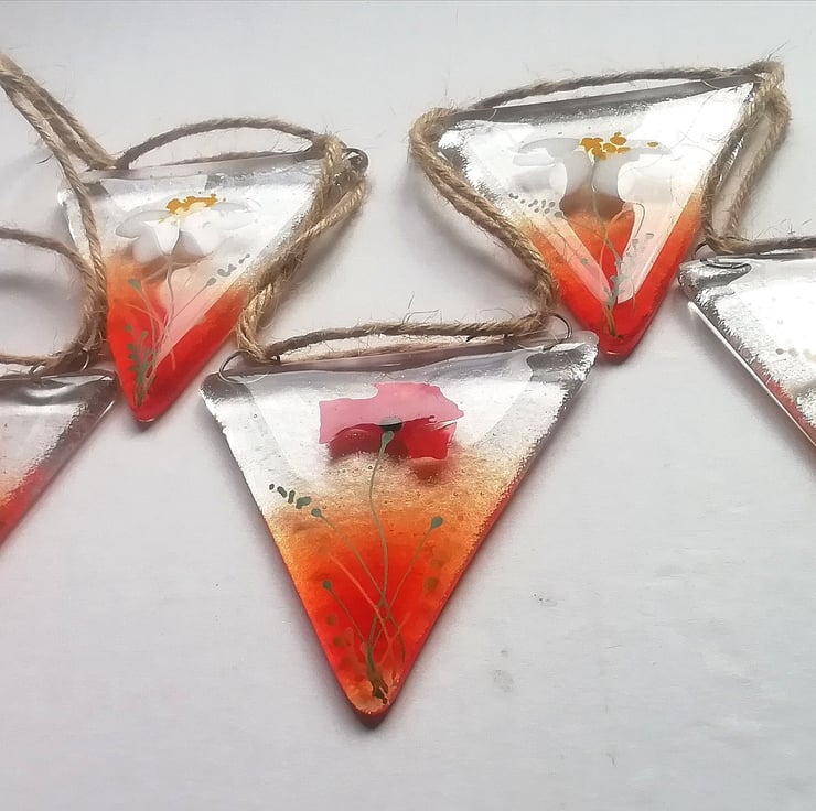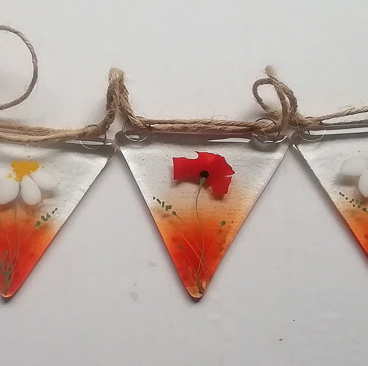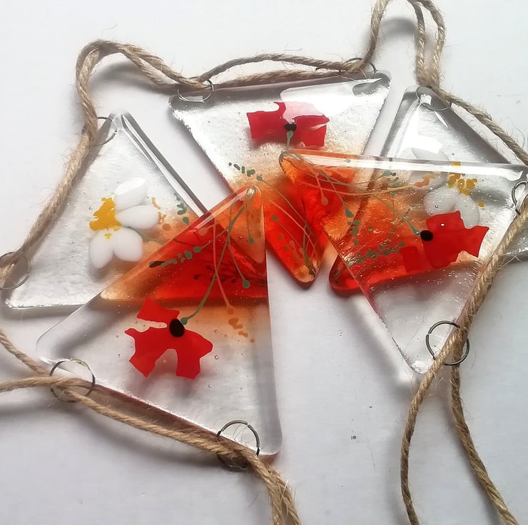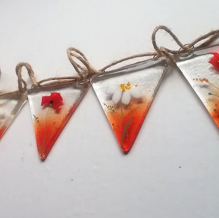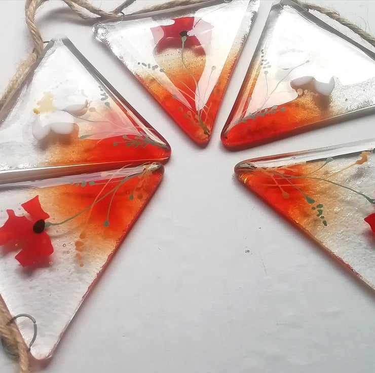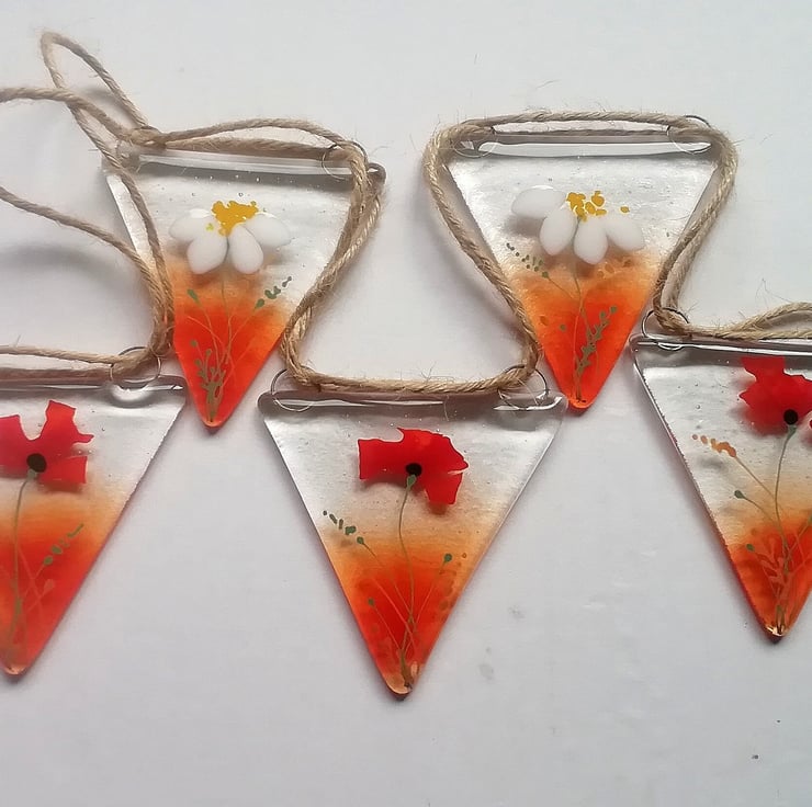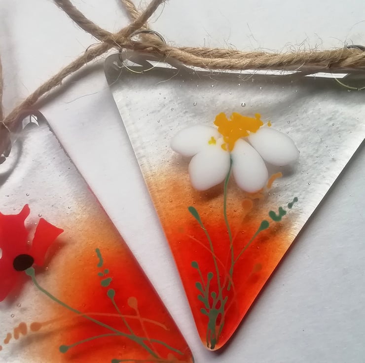 I've updated my poppy and daisy bunting for 2023. This is such a lovely bunting which can be used outdoors or in. In the summer I twirl my solar lights around the length and it looks stunning. I've hand cut all the glass and the poppy petals are confetti. The smaller details I add with glass enamels. I use lots of different shades of red which makes it into something special My bunting makes a really unique gift for someone you love.