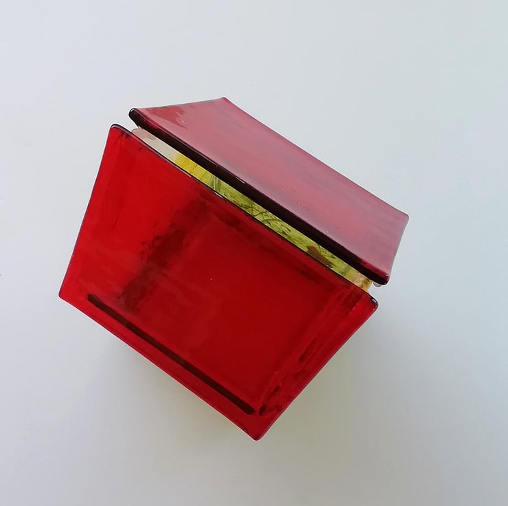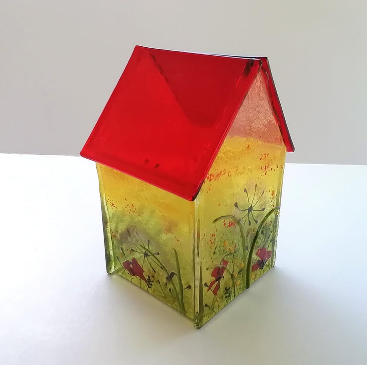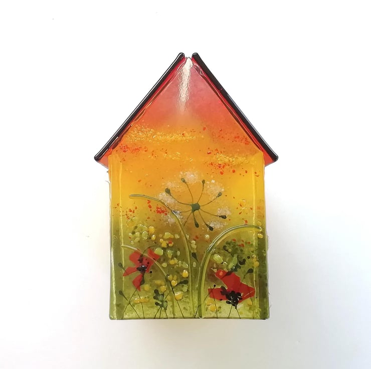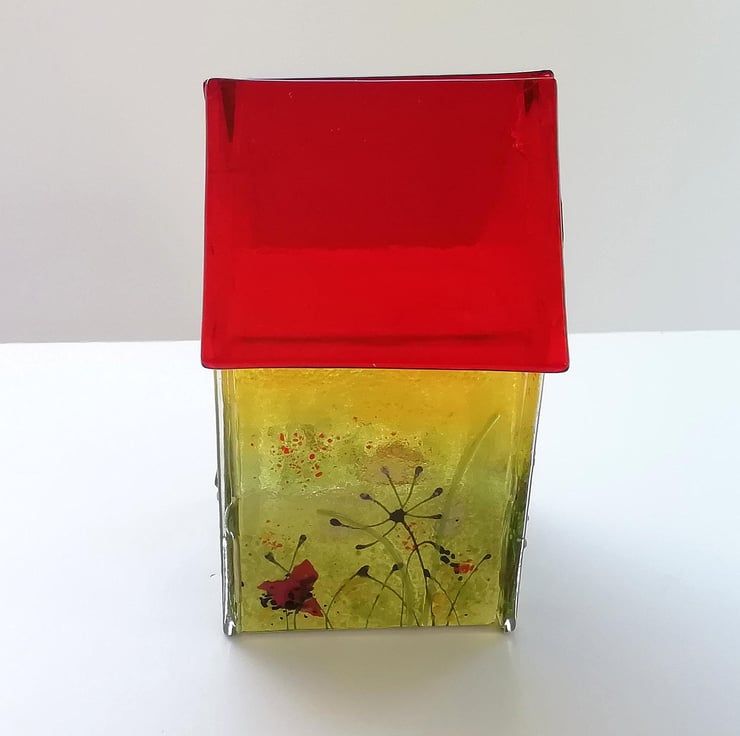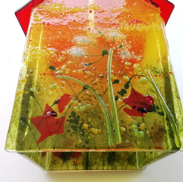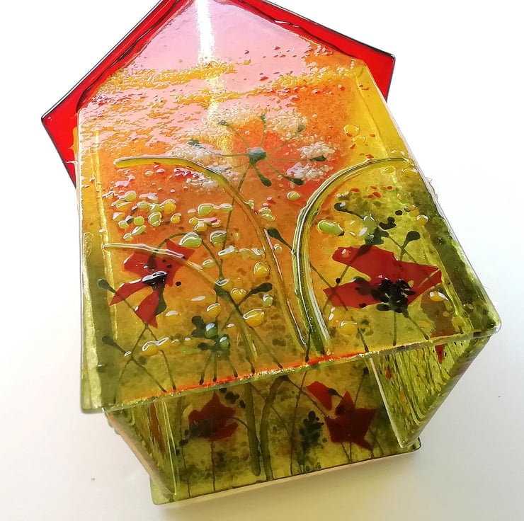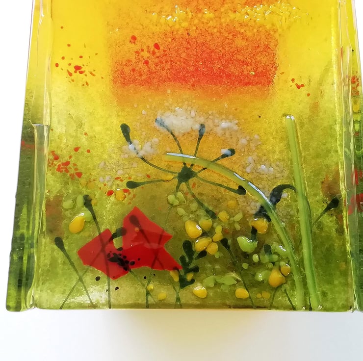 A gorgeous little tealight cover for battery tealights or microlights. Made to order,I hand cut my glass, I've added poppies, cornflowers, tiny stems and daisies. Stunning when lit up but as an ornament unlit it's super pretty. It goes into the kiln at a temperature of 755 which retains lots of texture. Once cool I silicone the sides together. Microlight batteries supplied.