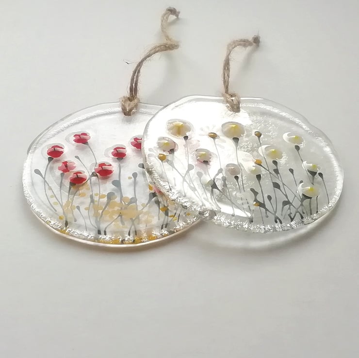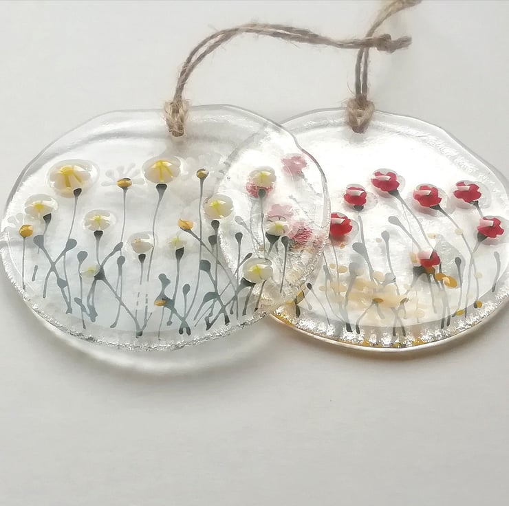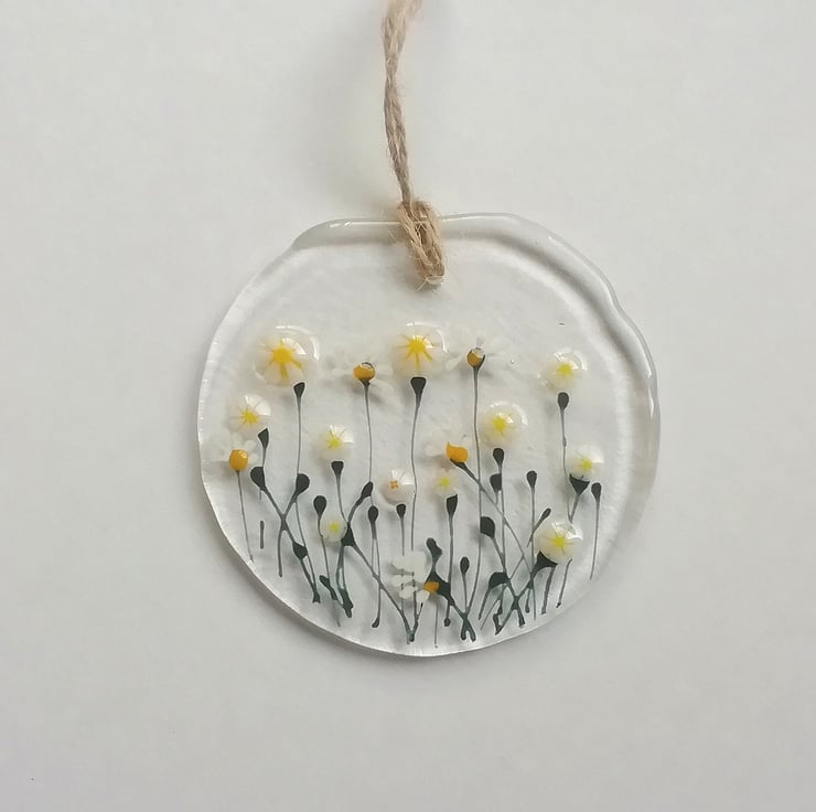 A lovely circular suncatcher, 8cms diameter. I hand cut my glass. I hand draw the details with glass enamels and add tiny murrini flowers. Once fused in my kiln I drill the hole to attach twine to hang it by. A perfect token gift