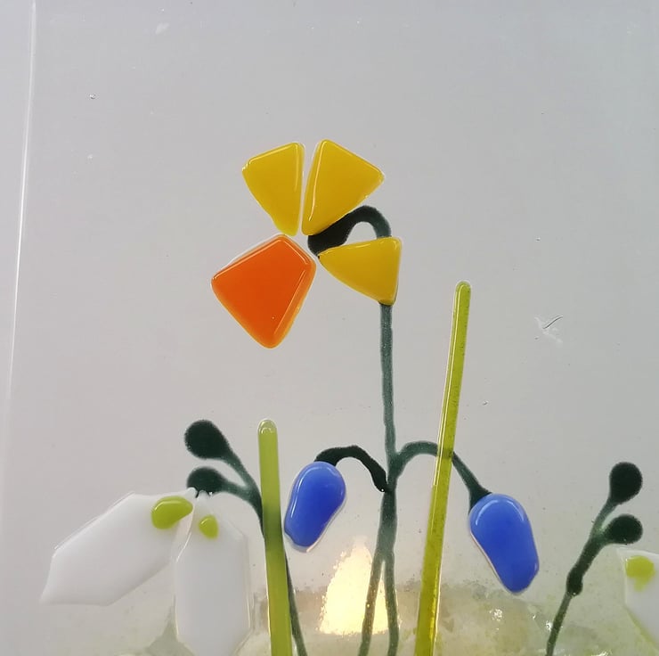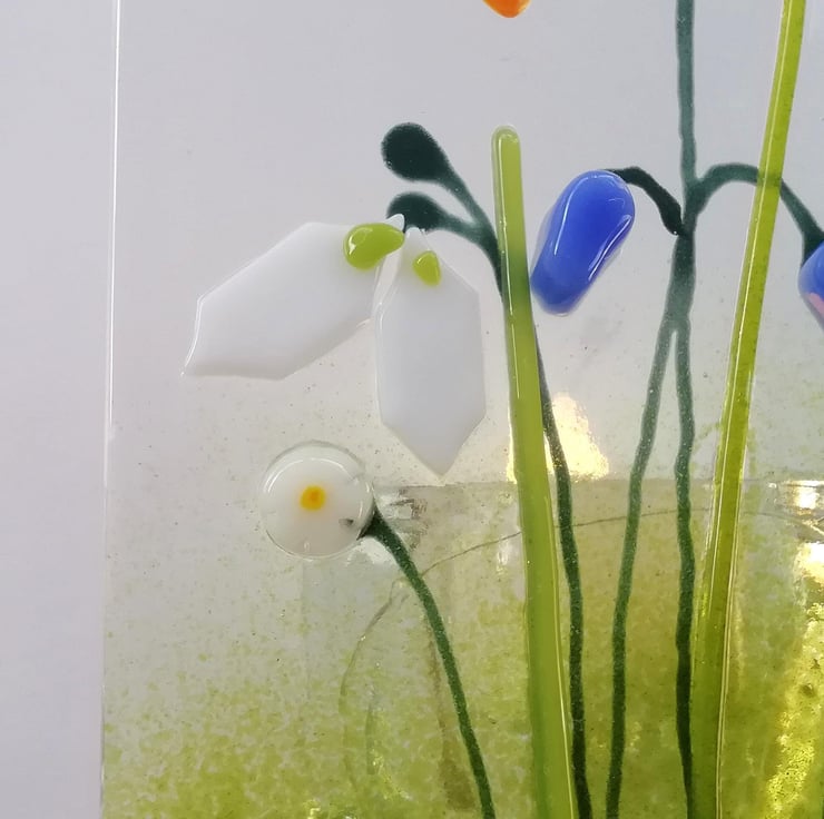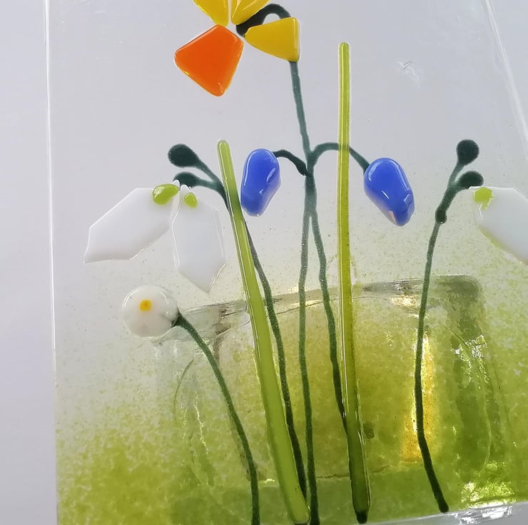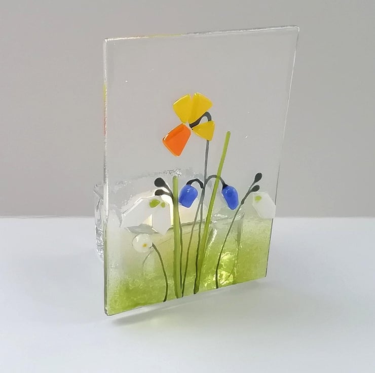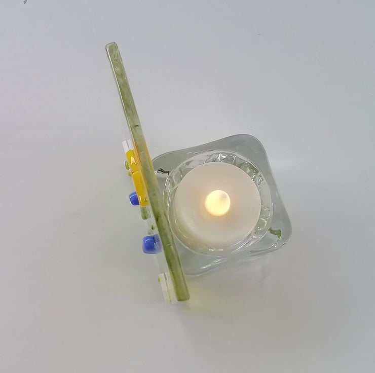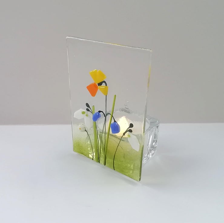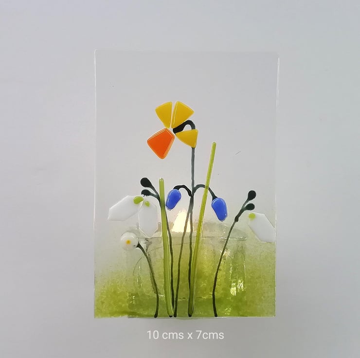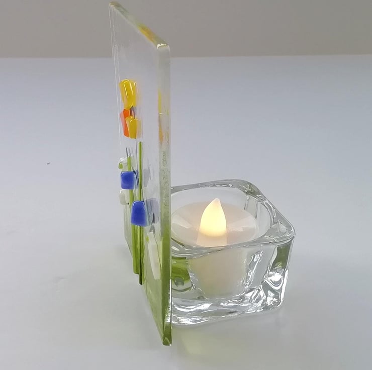 This would make a perfect gift for mum. Little tealight holder with a fused glass front panel. Comes supplied with a candle. I've hand cut my glass and shaped the tiny petals by hand. I then add the details with glass enamels. Once fused in my kiln I silicone the front glass panel onto the tealight, with an inperceptable tilt away from the named flame. Price is for one.