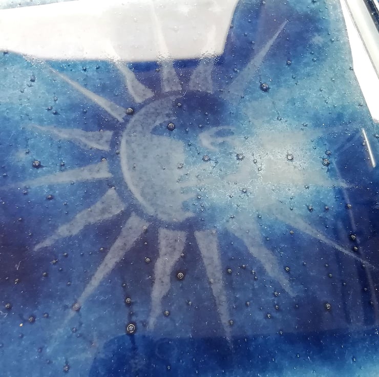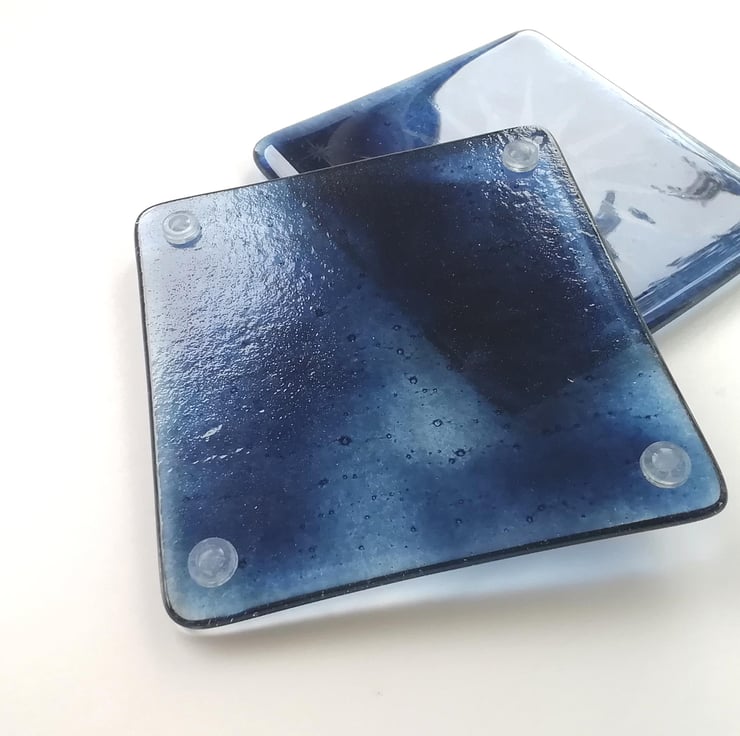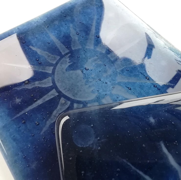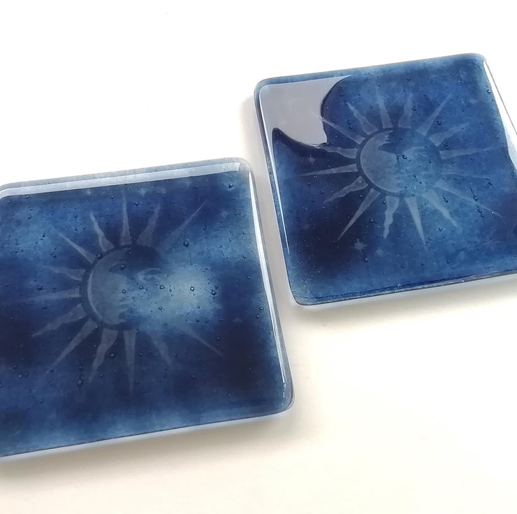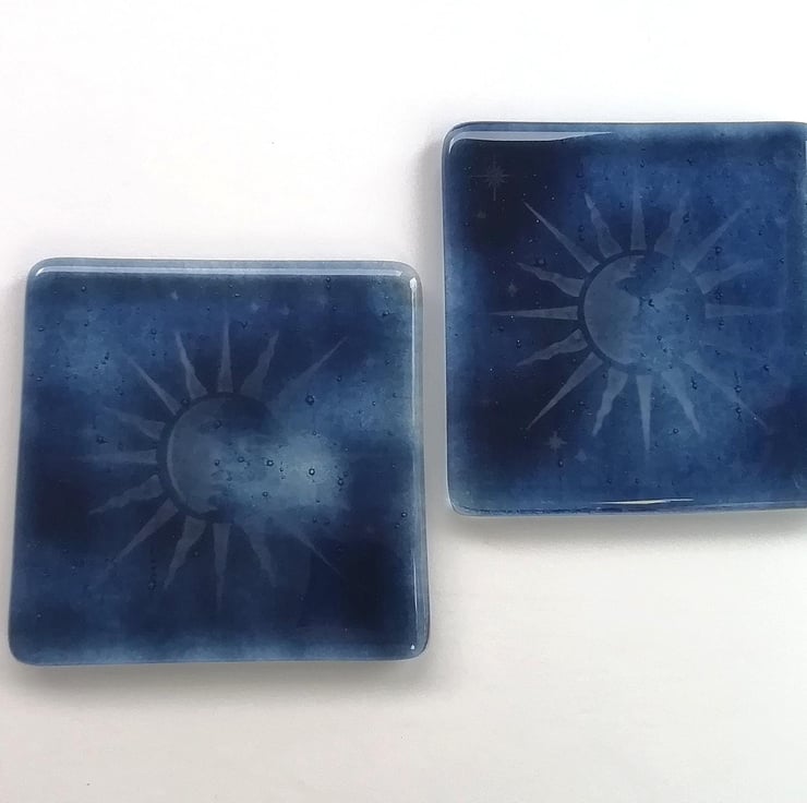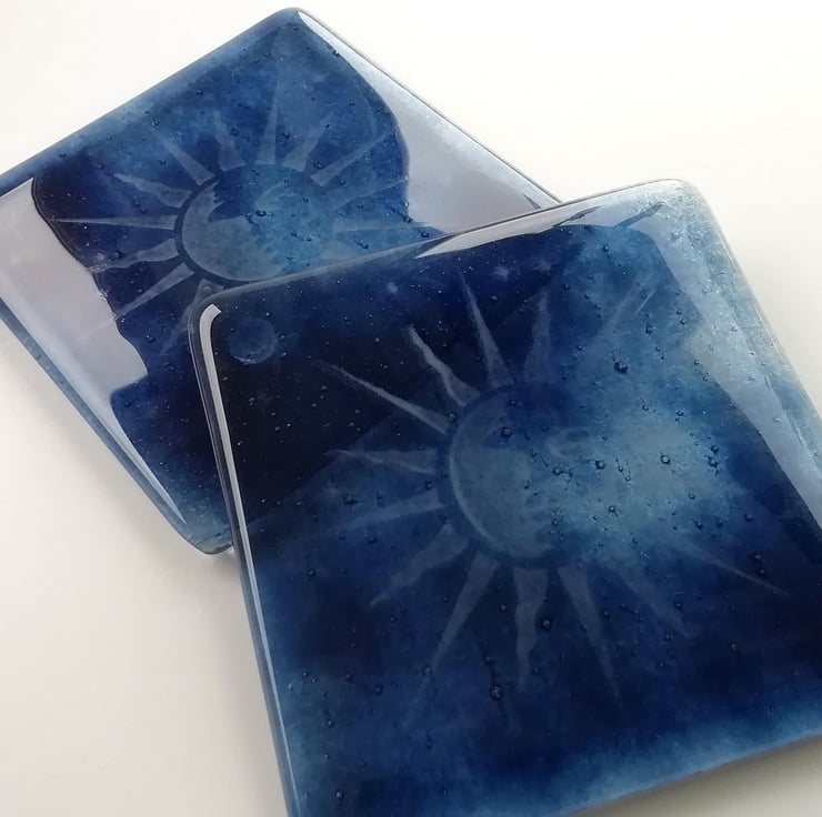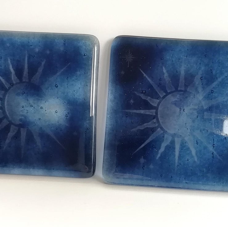 These are lovely subtle coasters with an image of a sun and moon on them. I've coloured them with dark blue sparkly glass, then stencilled the celestial image on top. I've keep it quite subtle so you see it as the light catches it. This is a set of two. They make a lovely unique gift.