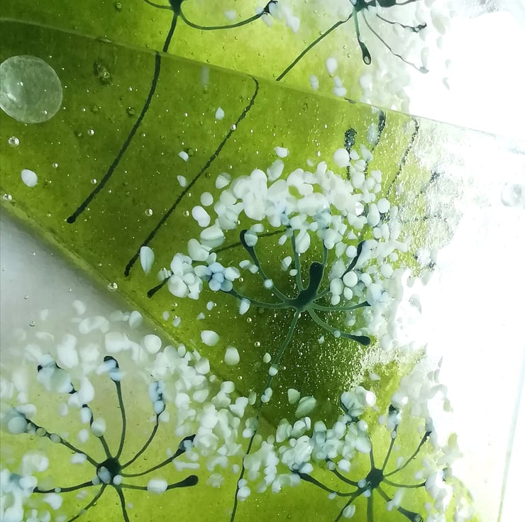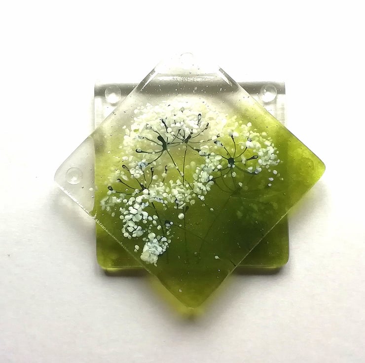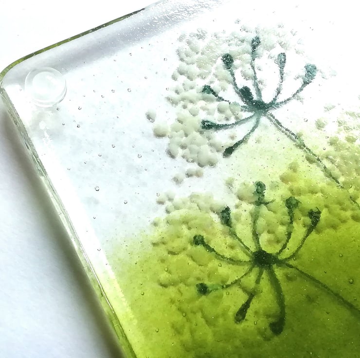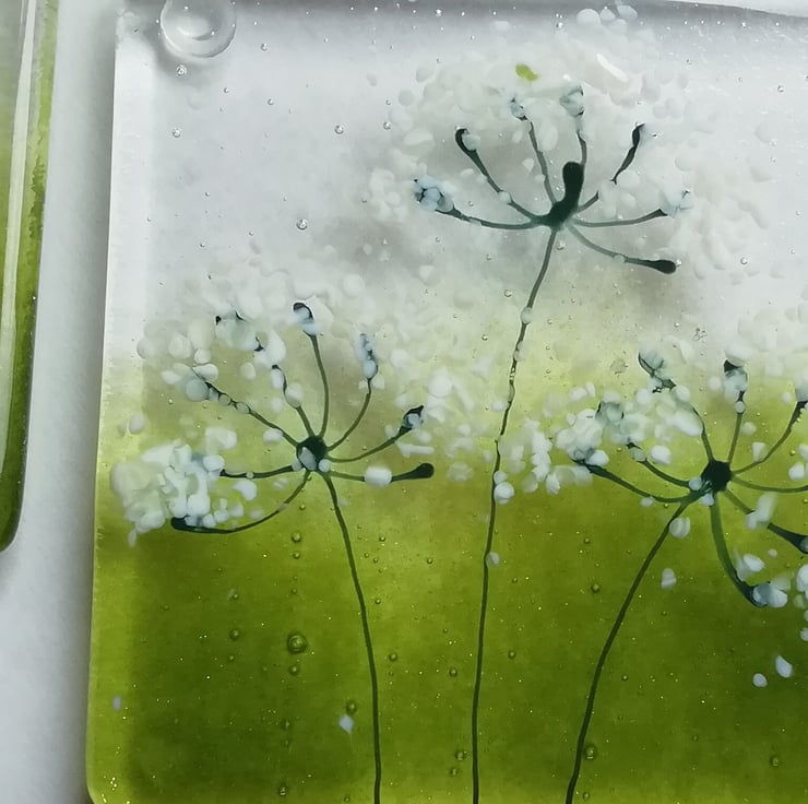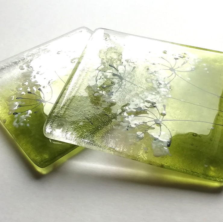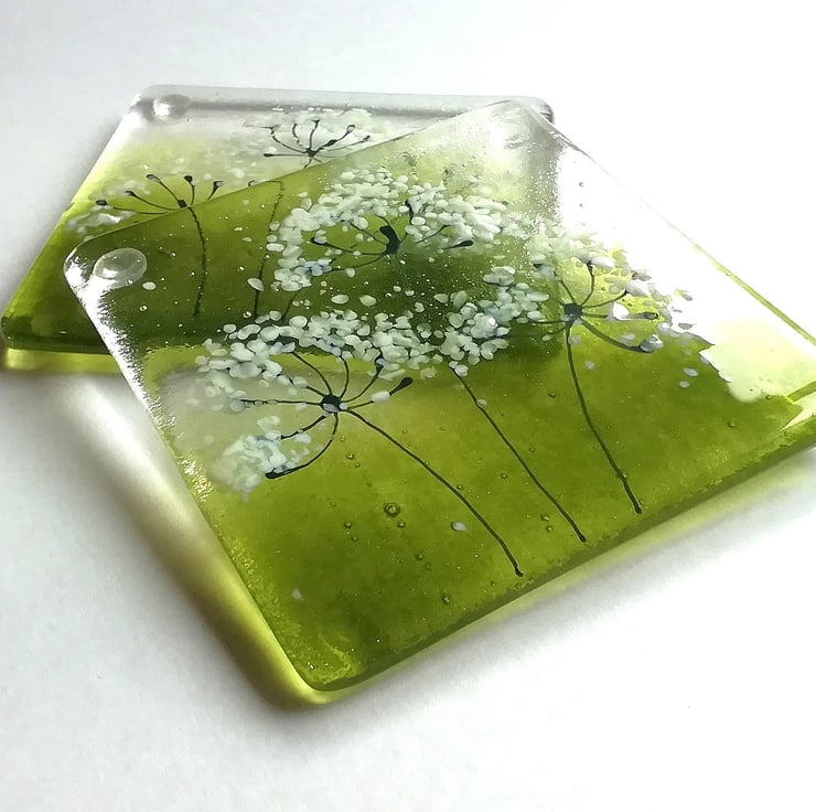 These are a lovely set of two fused glass coasters. I hand cut my glass and using powdered glass, crushed glass and enamels I created the lovely cowparsley heads. I adore seeing them in the hedgerows and verges and they sum up summer to me. These are perfect for that chilled glass Of wine on balmy evenings . I've attached rubber bumper feet which stops them slipping or scratching any surfaces.