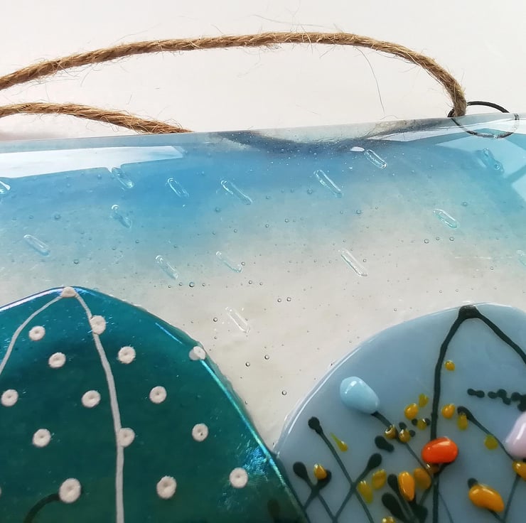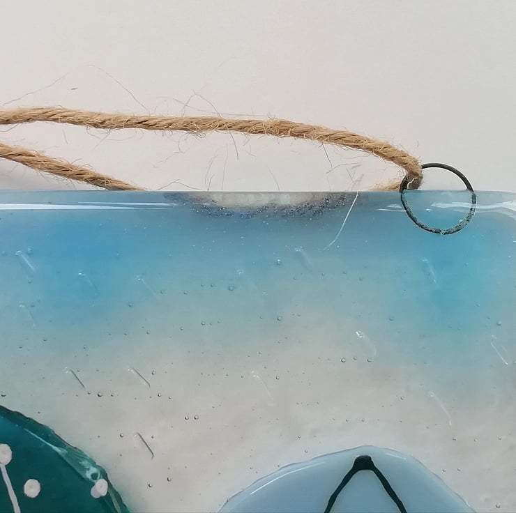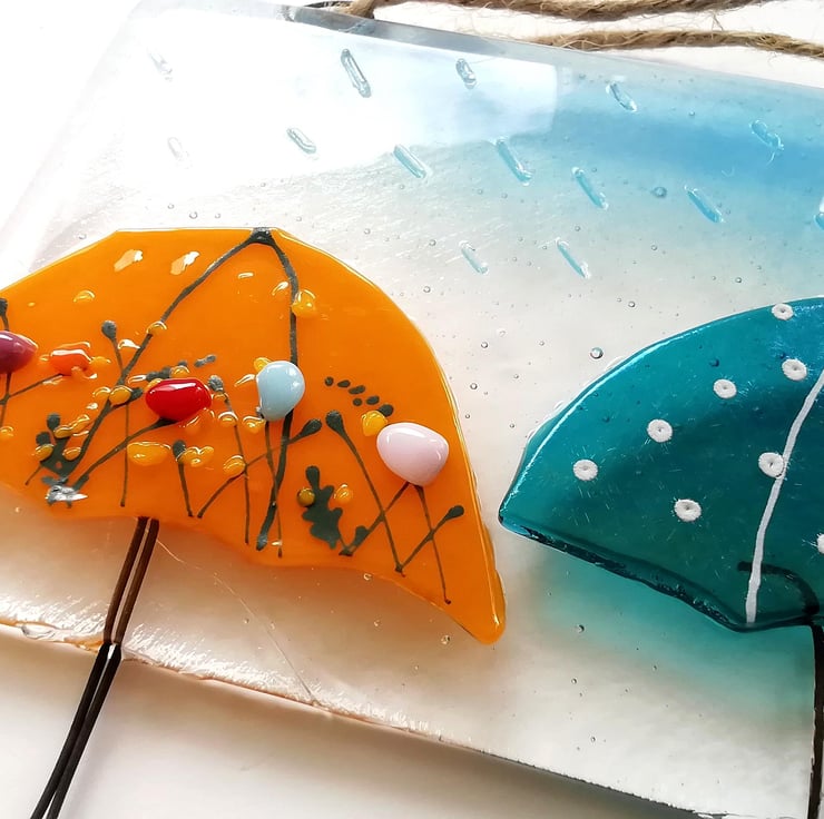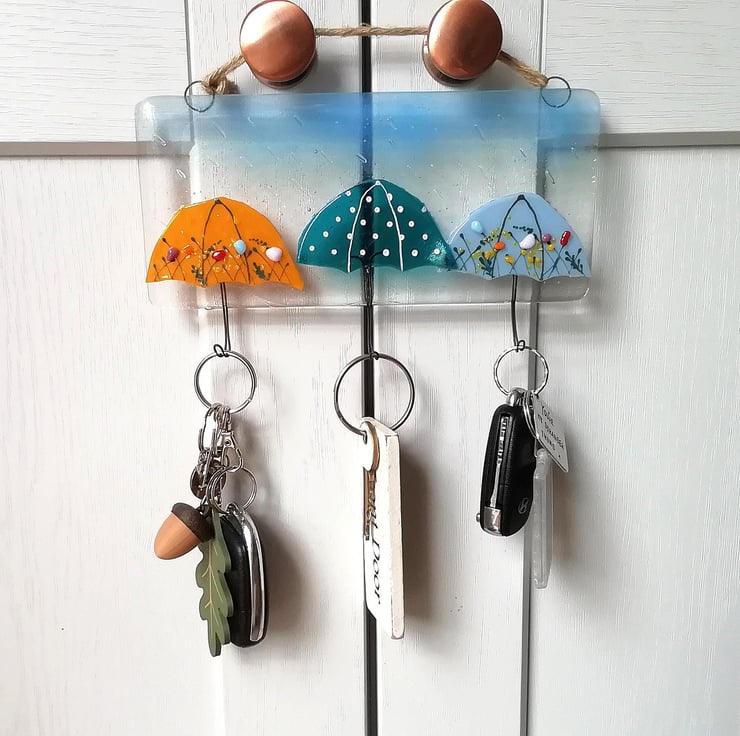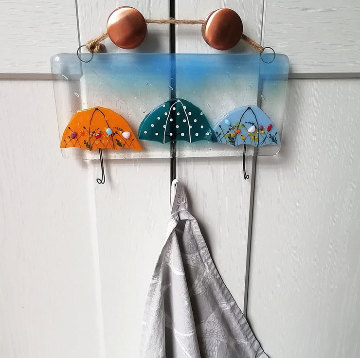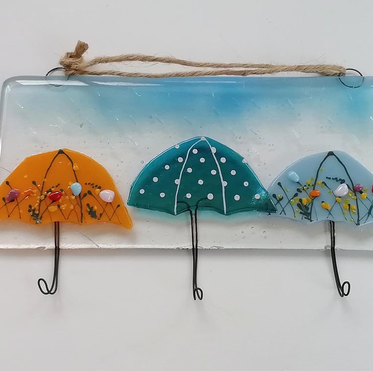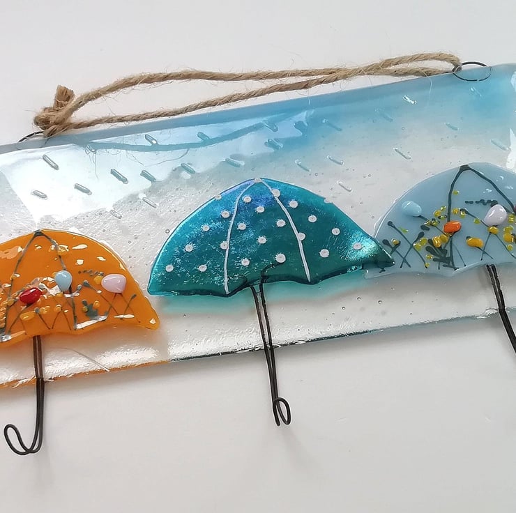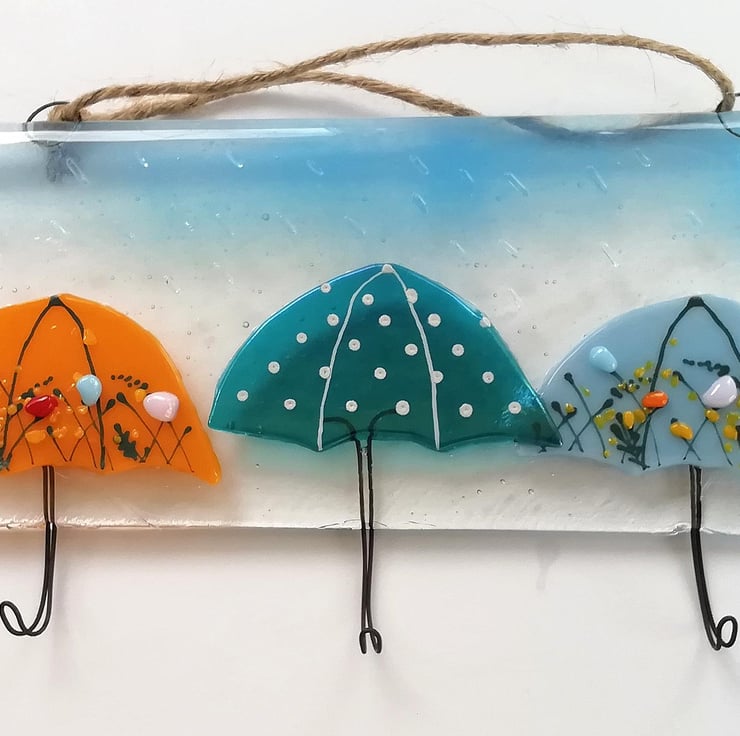 A really fun idea for your keys, tea towels, jewellery or dog lead? Anything that needs hanging is perfect on my colourful umbrella hooks. I hand cut my glass, this goes in to the kiln twice. The first for the base with the hooks and the second to add the umbrellas and rain drops. Three hooks make of strong nichrome wire. Twine to hang but can be screwed into a wall through the loops.