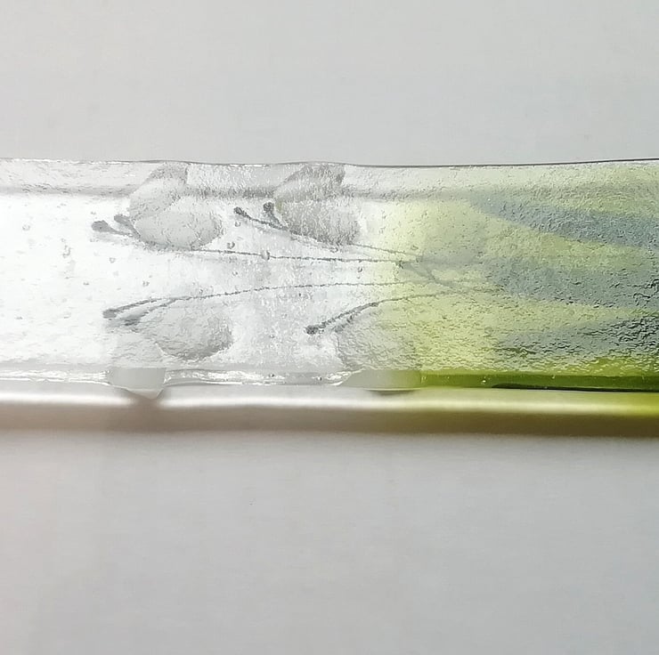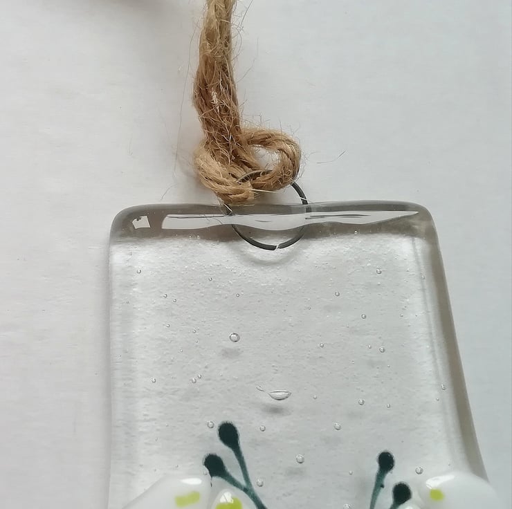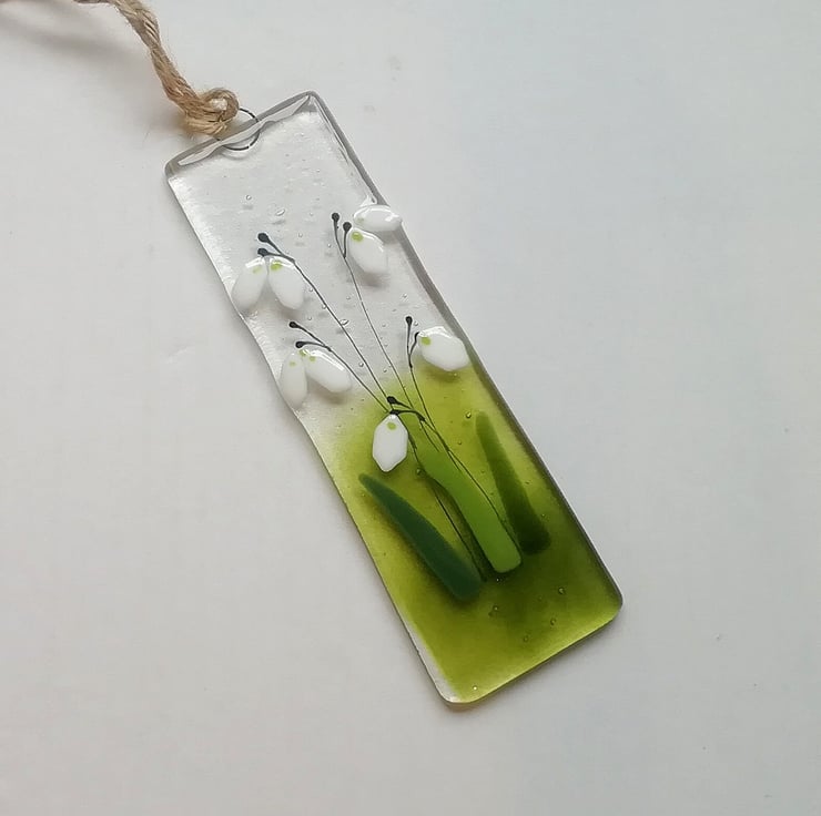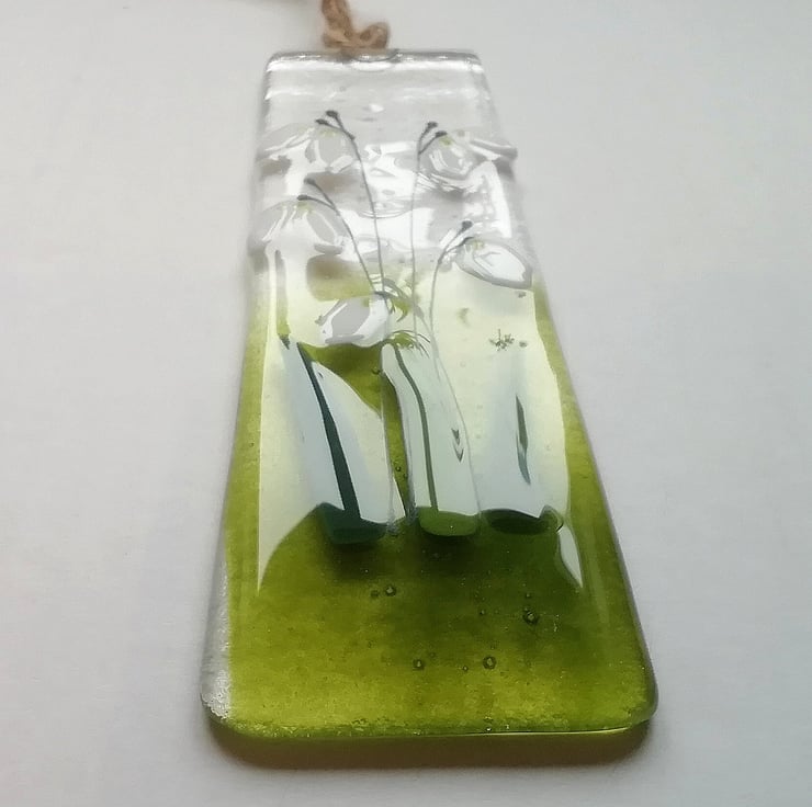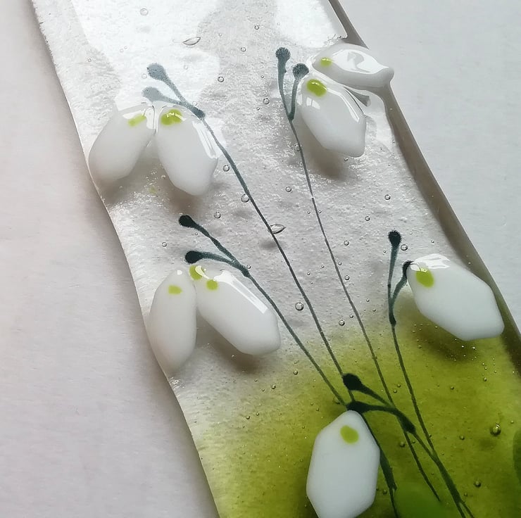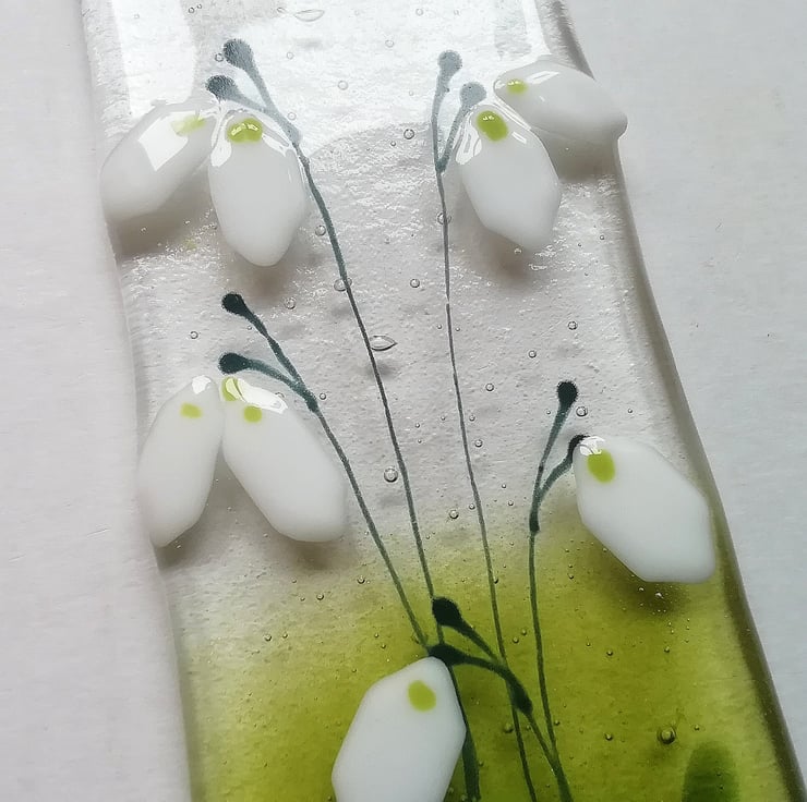 This is a stunning snowdrop scene in glass, I've handcut the glass and petals and fused in my kiln. It has lovely green leaves and three snowdrops hang down in the scene, some details are drawn with glass enamels. It would look lovley in a window, or on a cupboard door. Sometimes the colours or design will vary from the pictures very slightly, as is the nature of hand made. The overall look will always be very similar.