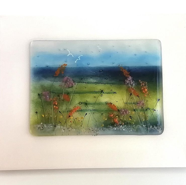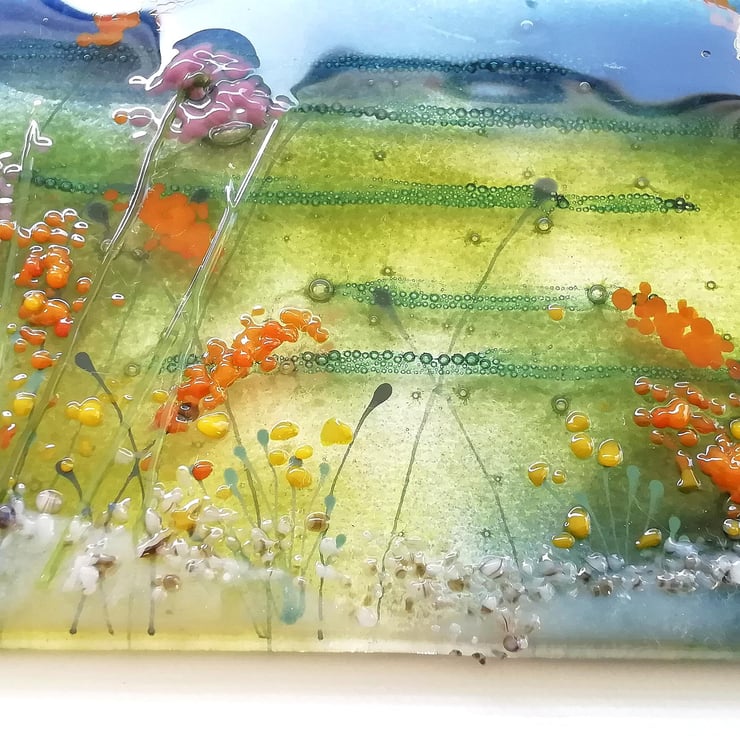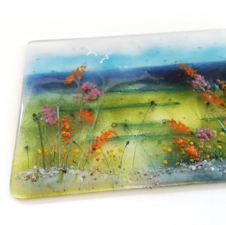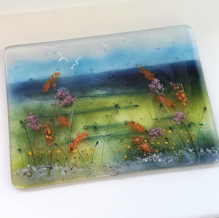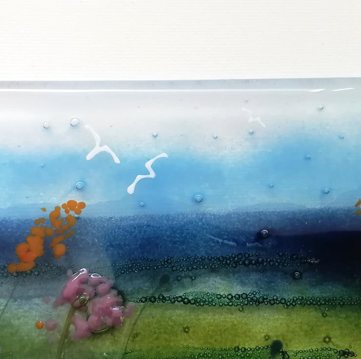This piece took three fusings and lots of time which was great fun. A lovely coastal scene that I've layered with each fusing to give it lots of depth. I've used powdered glass, stringers, glass enamels and crushed glass in a variety of ways which pushed me to use lots of techniques.