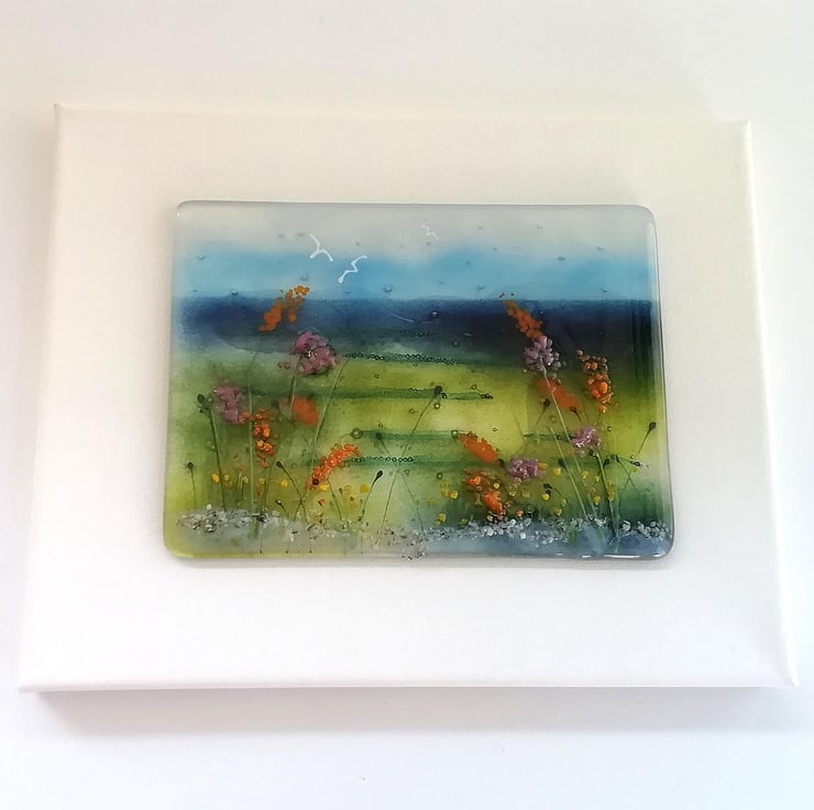 Fused Glass Seascape Art: Coastal Landscape on Stretched Canvas