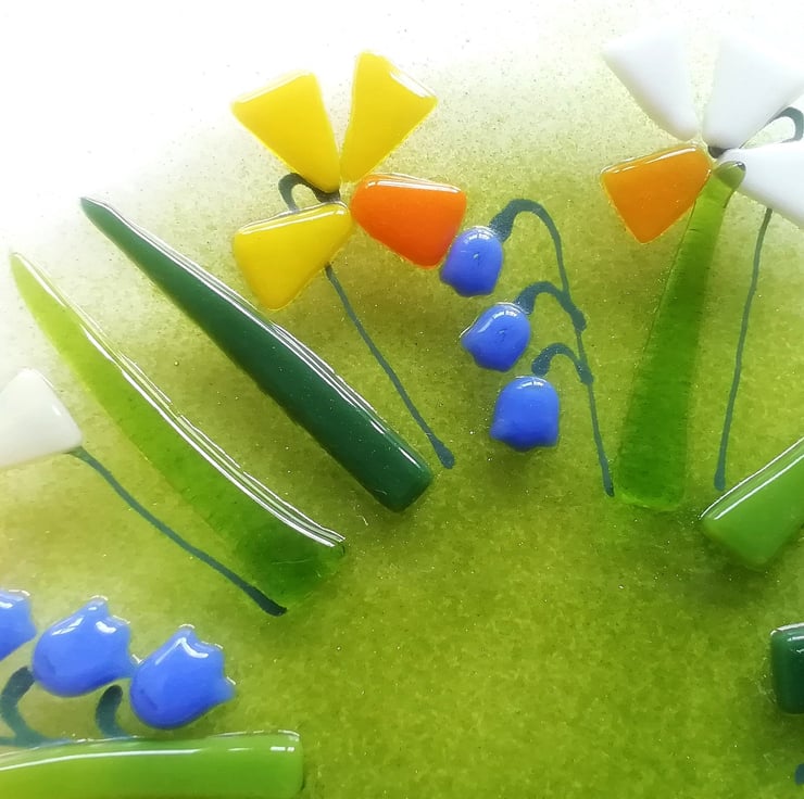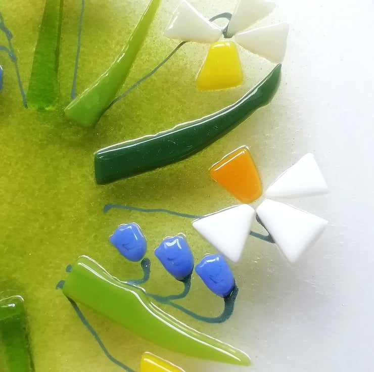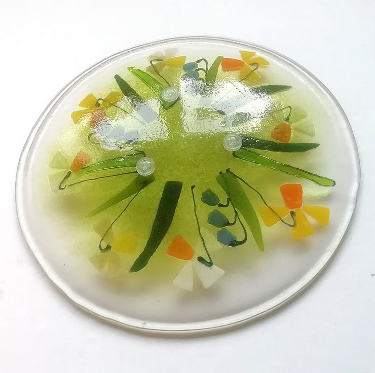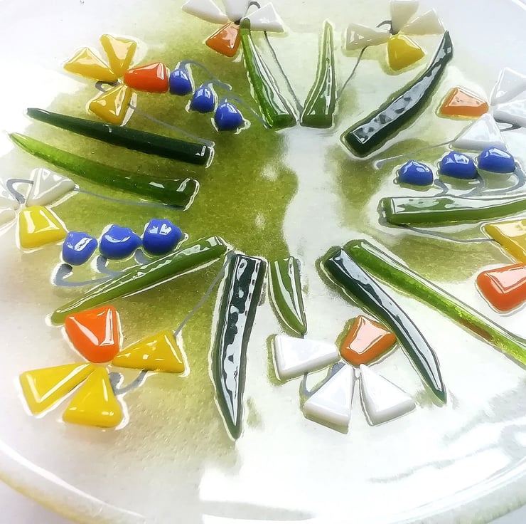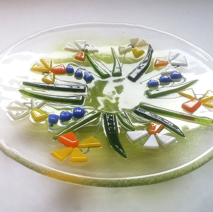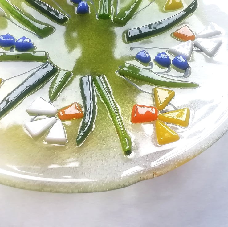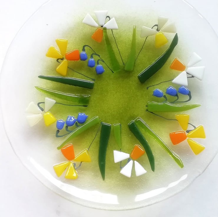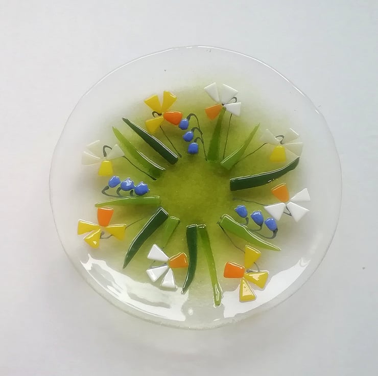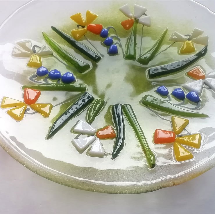 A beautiful glass art dish, small but perfect to display on a dish stand. I hand cut my glass (which is why some of my edges are slightly organic!). Each tiny petal is nipped into shape, I add details with glass enamels drawn by hand. This bowl has visited the kiln three times, the final time to slump into its shape. It looks stunning displayed on a windowsill or shelf or would make a perfect gift.