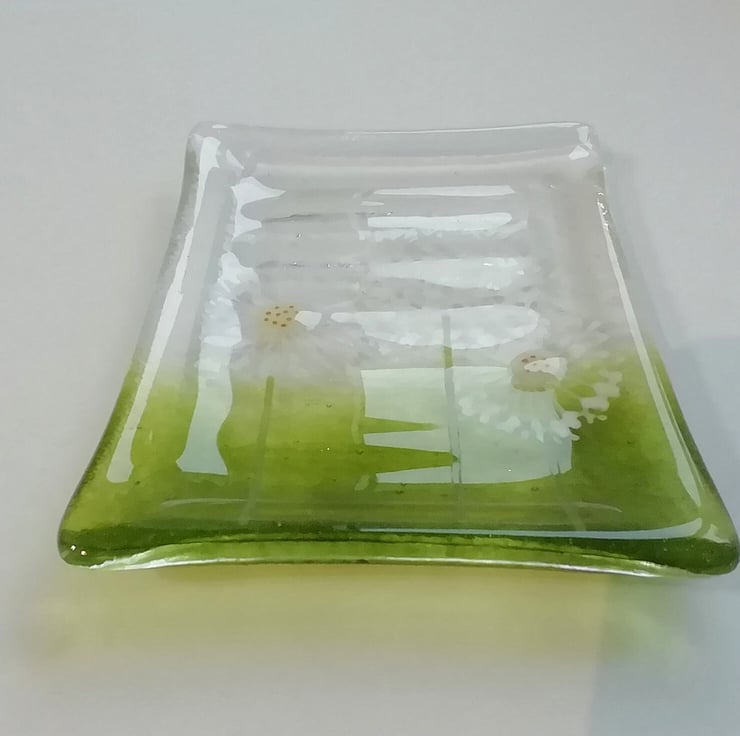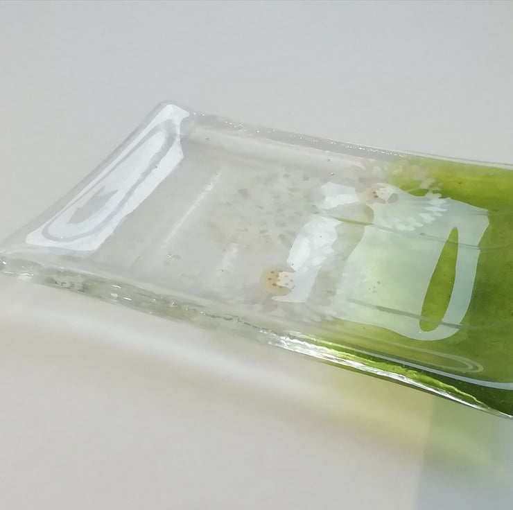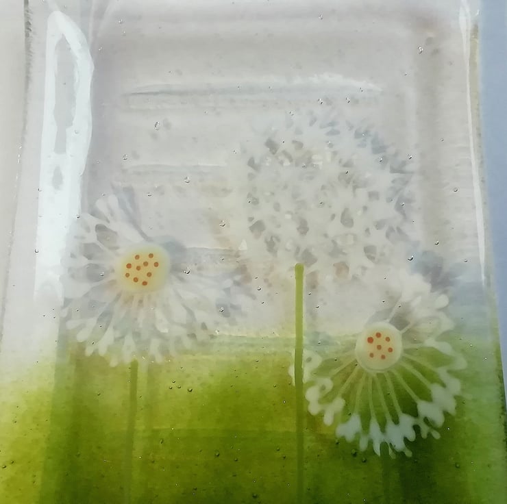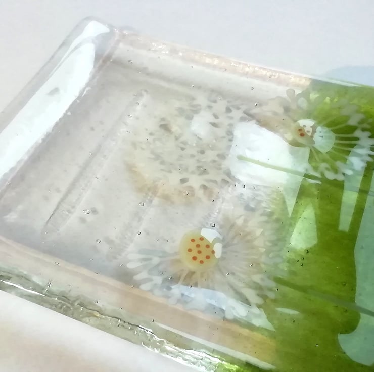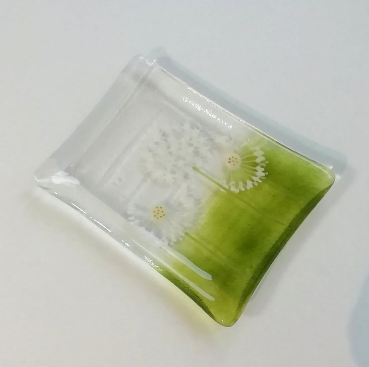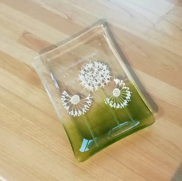 A lovely little soap dish that I've hand cut. I hand draw the dandelions with glass enamels which gets fused into the glass. It then goes back into the kiln to be slumped into the mould. It's a lovely addition to a bathroom that guests use, or a pretty housewarming gift.