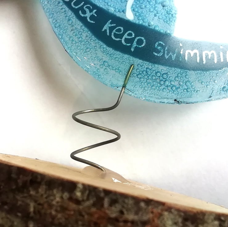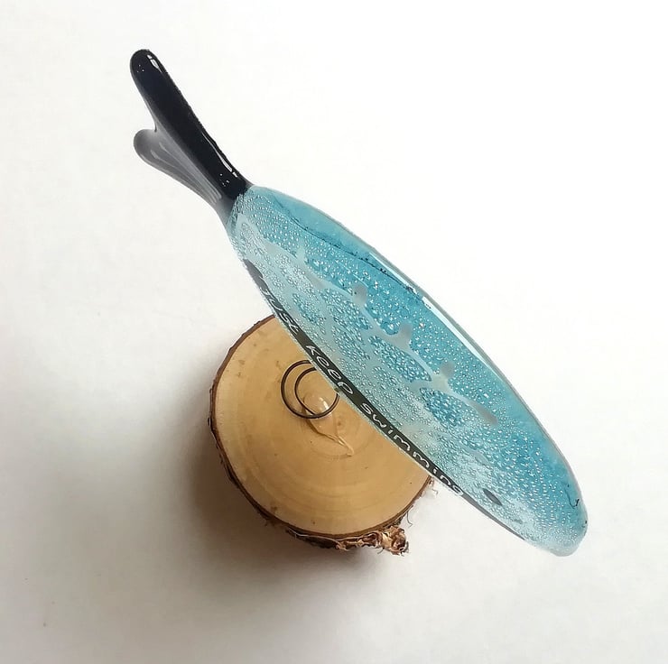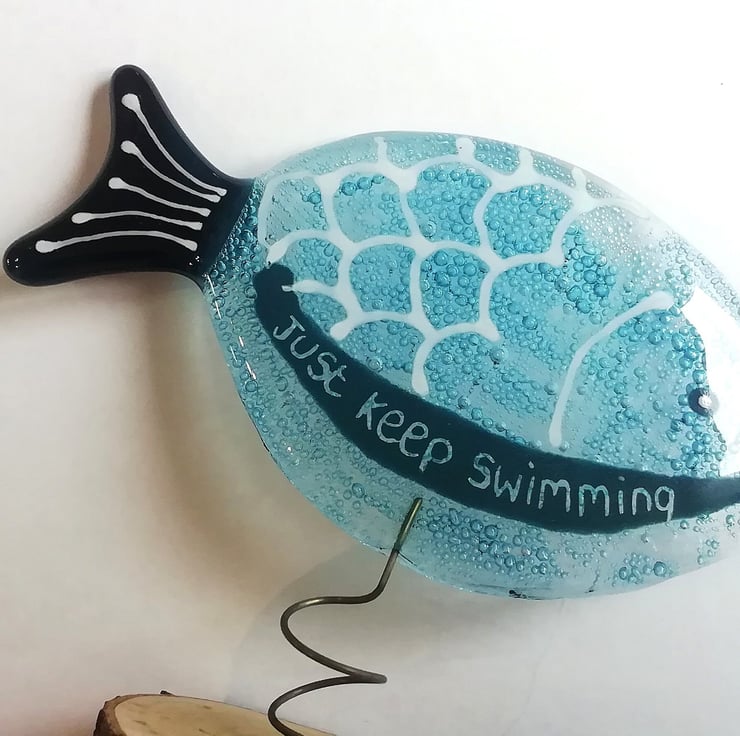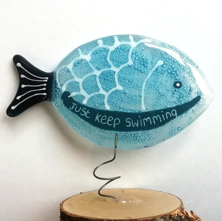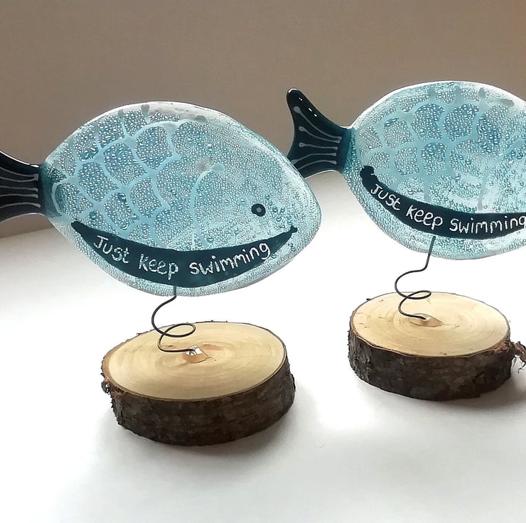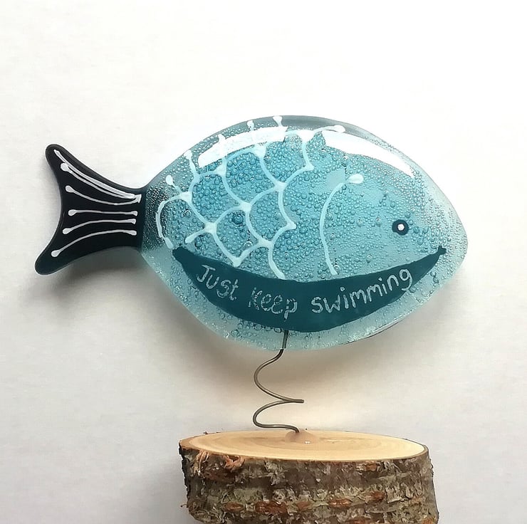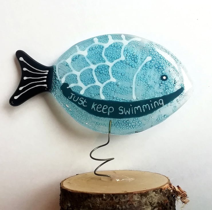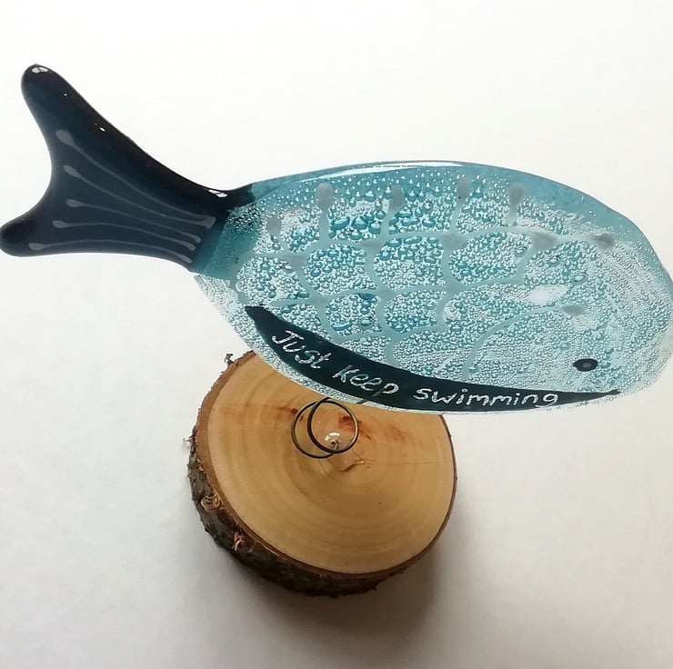 This is great fun, a fused glass fish that wobbles as if swimming. He's full of deep blue bubbles and I've created the lettering by a technique called "sgraffito" allowing the bubbles to be seen through the lettering. I've handcut the glass and used copper oxide for the bubbles that are trapped inside him. When mounting him I coiled the wire which allows him to rock as if swimming. The lettering says "just keep swimming" . He stands on a log slice and is perfect on a windowsill.