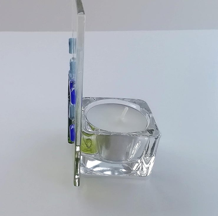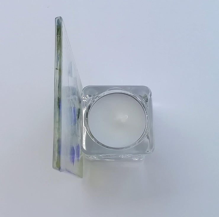 This would make a perfect gift for mum. Little tealight holder with a fused glass front panel. Comes supplied with a candle. I've hand cut my glass and shaped the tiny petals by hand. I then add the details with glass enamels. Once fused in my kiln I silicone the front glass panel onto the tealight, with an inperceptable tilt away from the named flame. Price is for one.