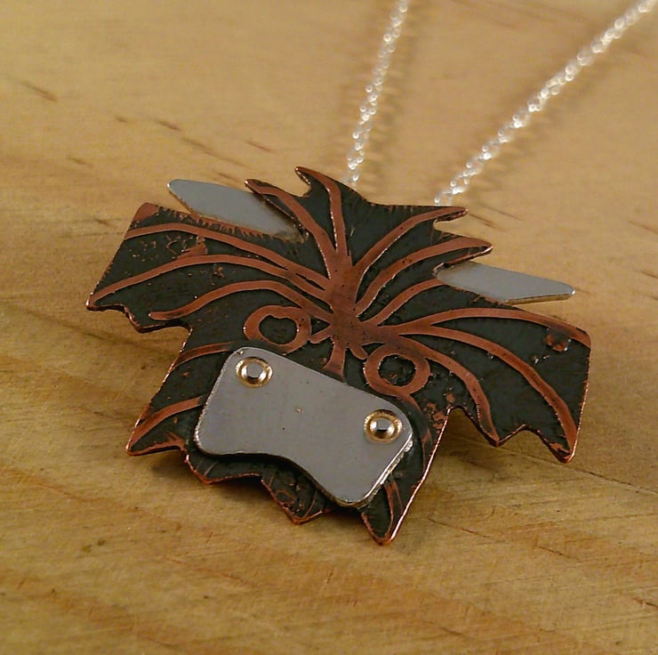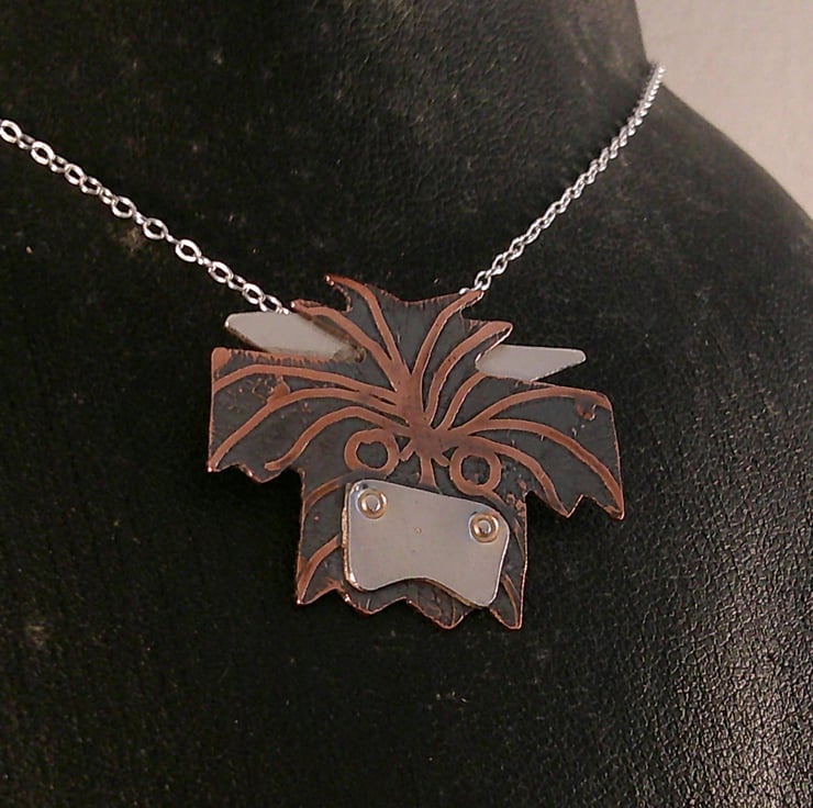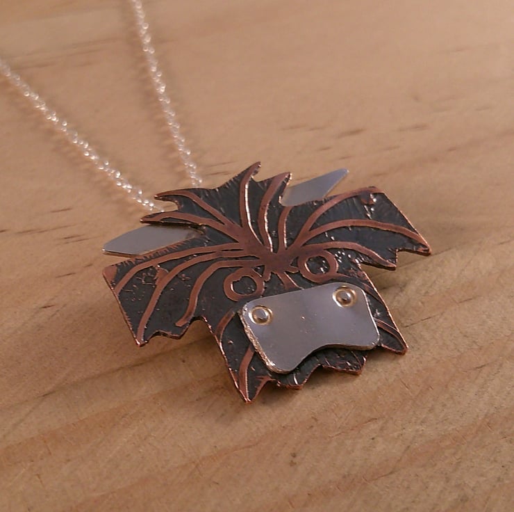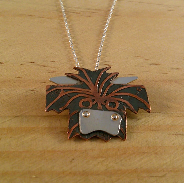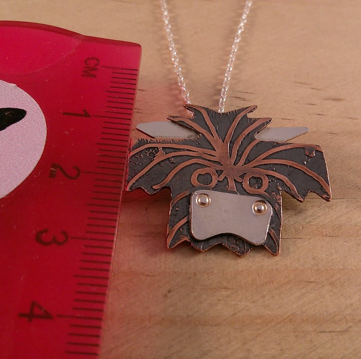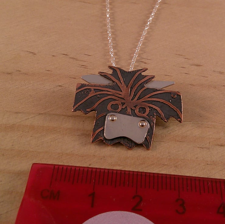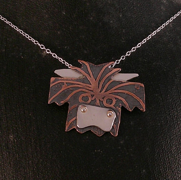 This cute necklace has been hand made from sheets of 100% recycled sterling silver and copper. The head of the Highland cow has been hand pierced from a sheet of copper and etched with the fur. The horns and the nose have been hand pierced from sterling silver and soldered on. A loop has been soldered to the back and the necklace has been oxidised to blacken the etched details.