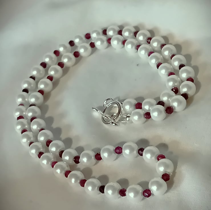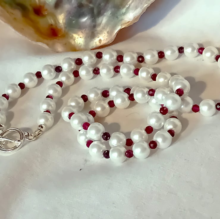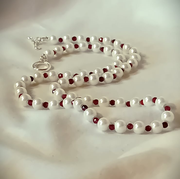 This exquisite necklace features genuine Freshwater Pearls (6mm) paired with beautifully faceted Garnets (2mm), all elegantly strung on silk and secured with a Sterling Silver Toggle Clasp.